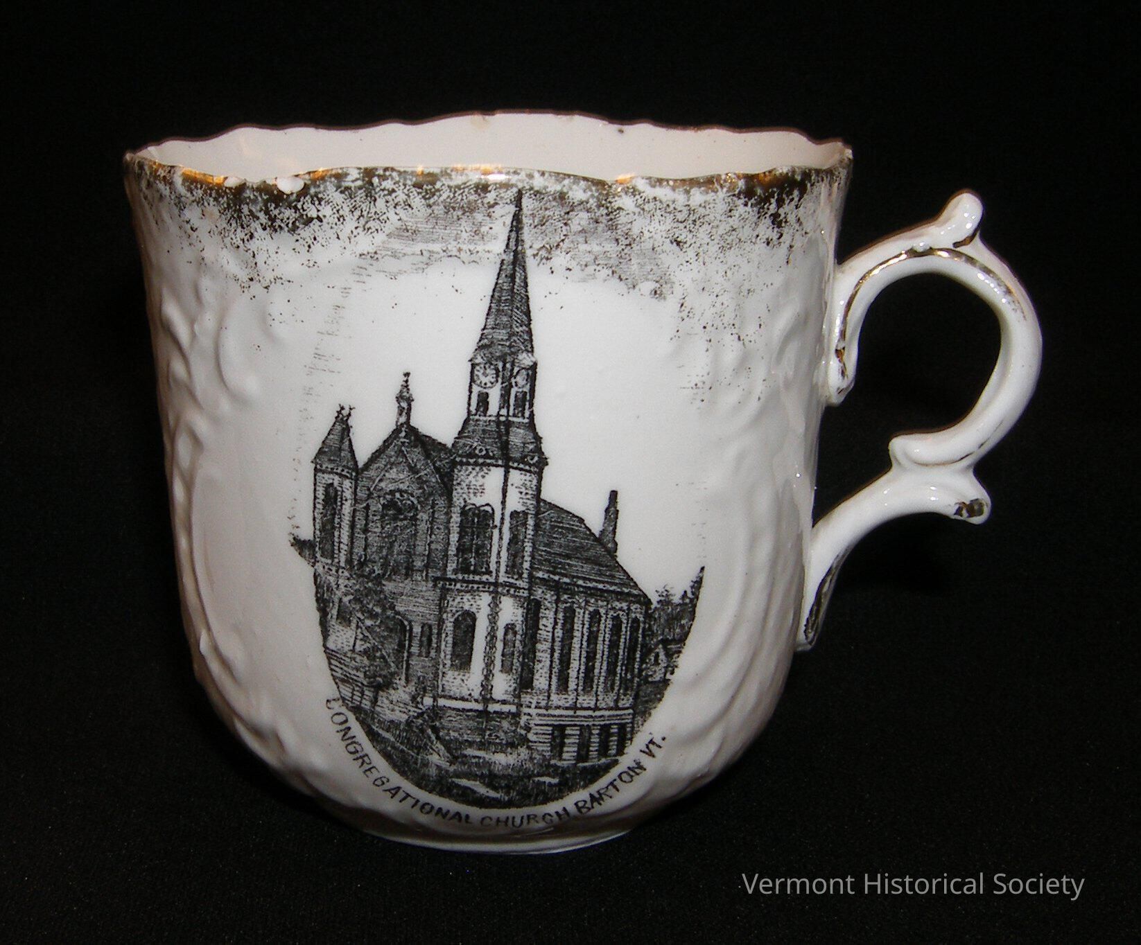 White porcelain demitasse cup with handle. The cup is printed on one side with an illustration of a church building with a tall clocktower and steeple on the right front corner. The image is labeled, "CONGREGTIONAL BHURCH, BARTON VT." The bottom of the cup is marked, "MADE IN GERMANY FOR H.T. SEAVER CHINA HALL, BARTON, VT."