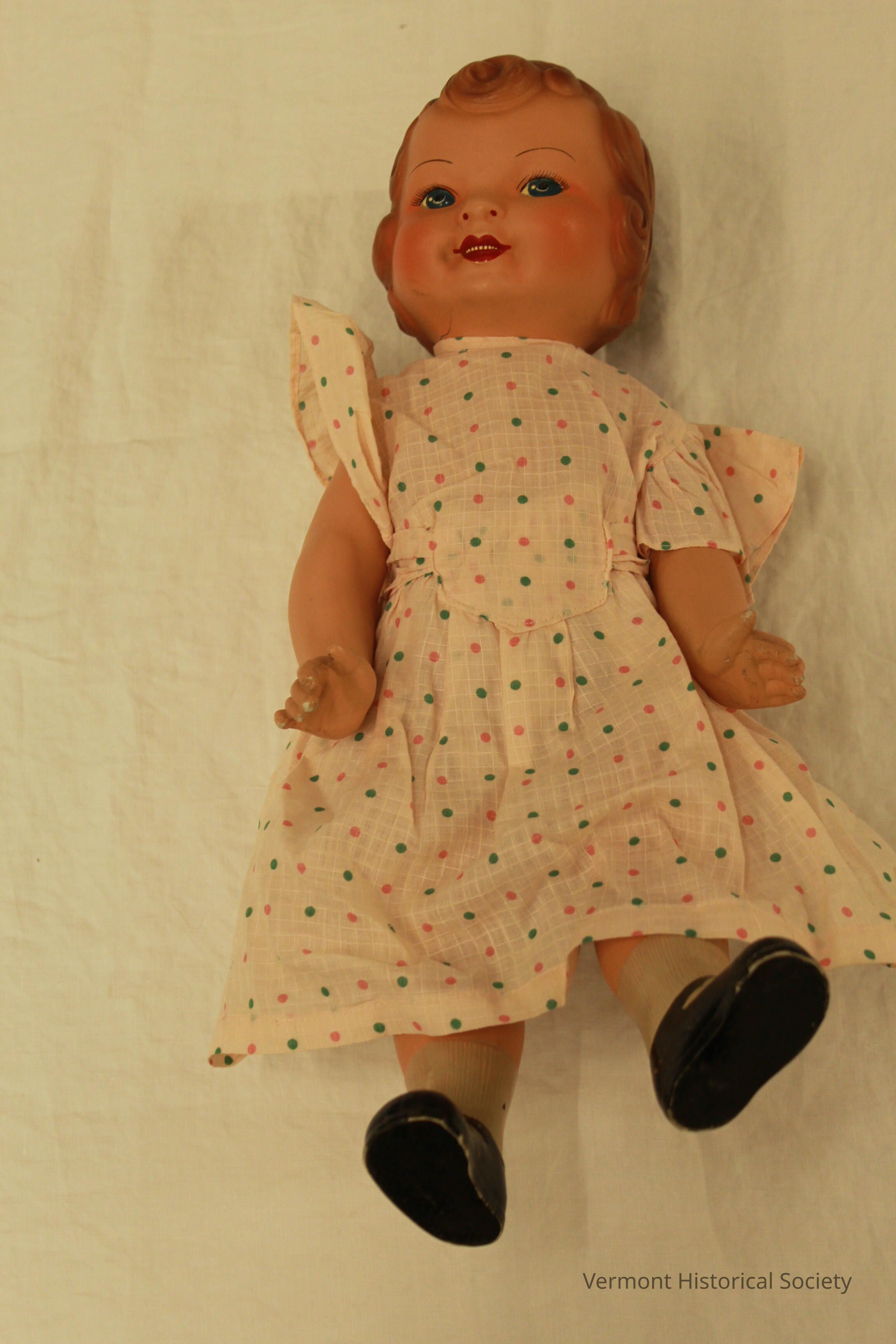 Doll in a pink dress, with pink and green dots, moveable arms and legs, hair part of head, crack in neck and paint worn off fingers. Note found with doll says "Francine Jeannard (12 years), 4 Rue Dumont d'Urville, LaGarenne."Context