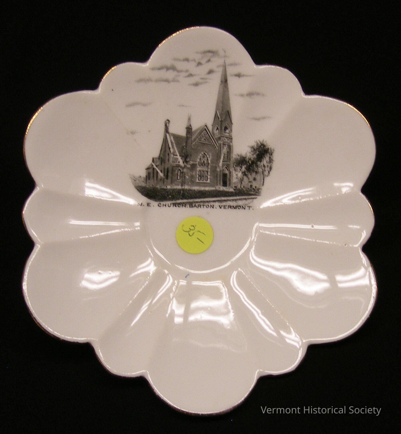White ceramic scalloped or flower-shaped saucer. The saucer is printed with a copperplate illustration of a church building with a large steeple at the front right corner. The image is labeled, "M. E. CHURCH, BARTON, VERMONT." The bottom of the dish is marked, "MADE IN ENGLAND H. T. SEAVER, BARTON, VT."Context