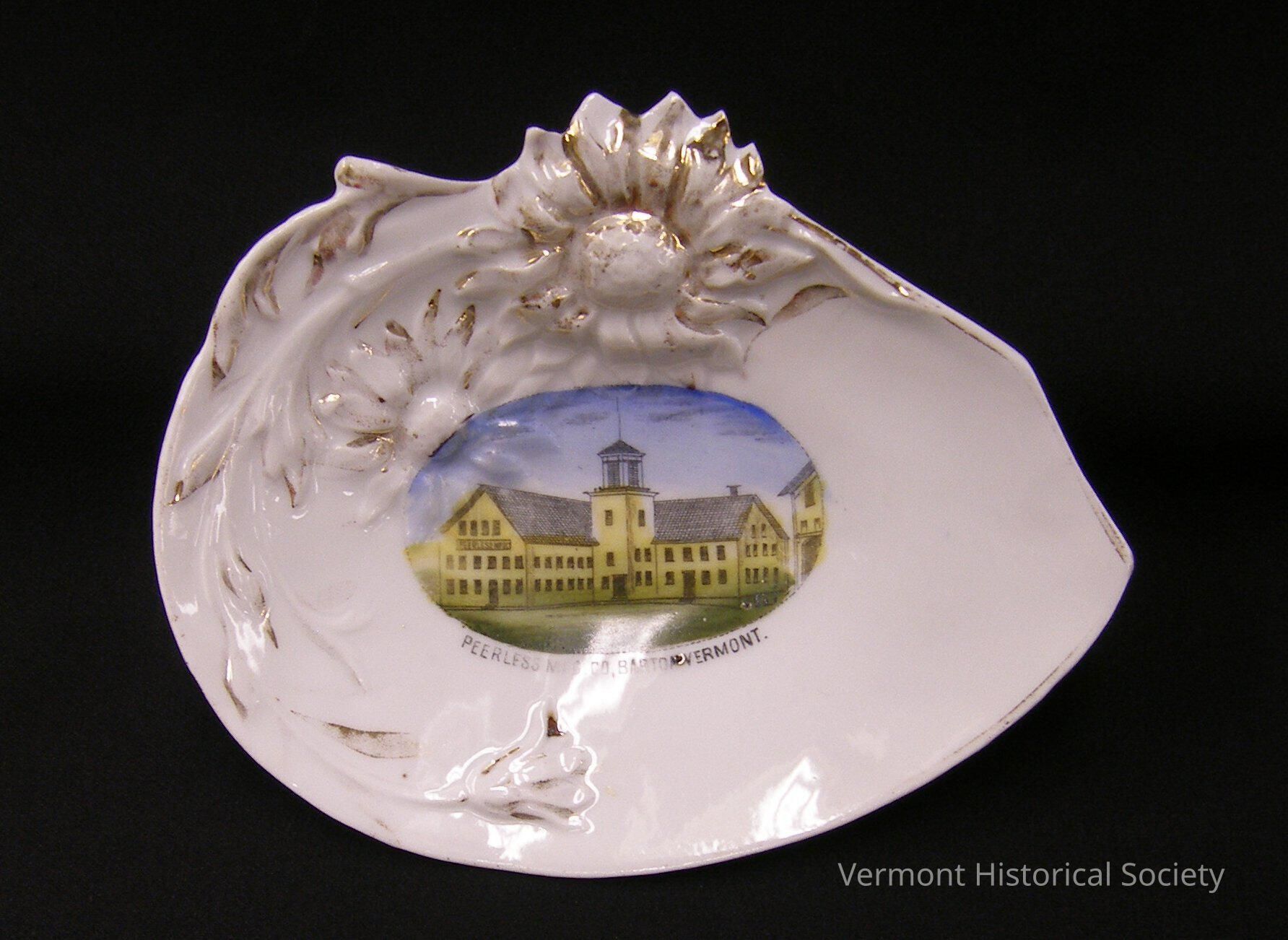 Oval-shaped candy dish molded on one side with leaves and sunflowers, accented with gilding. The center is printed with an illustration of a large factory building painted in stripes of blue, yellow, and green. The image is labeled, "PEERLESS MFG. CO, BARONT VERMONT". The bottom of the dish is marked, "Made in Germany for C. P. Jenness Barton Vt."Context