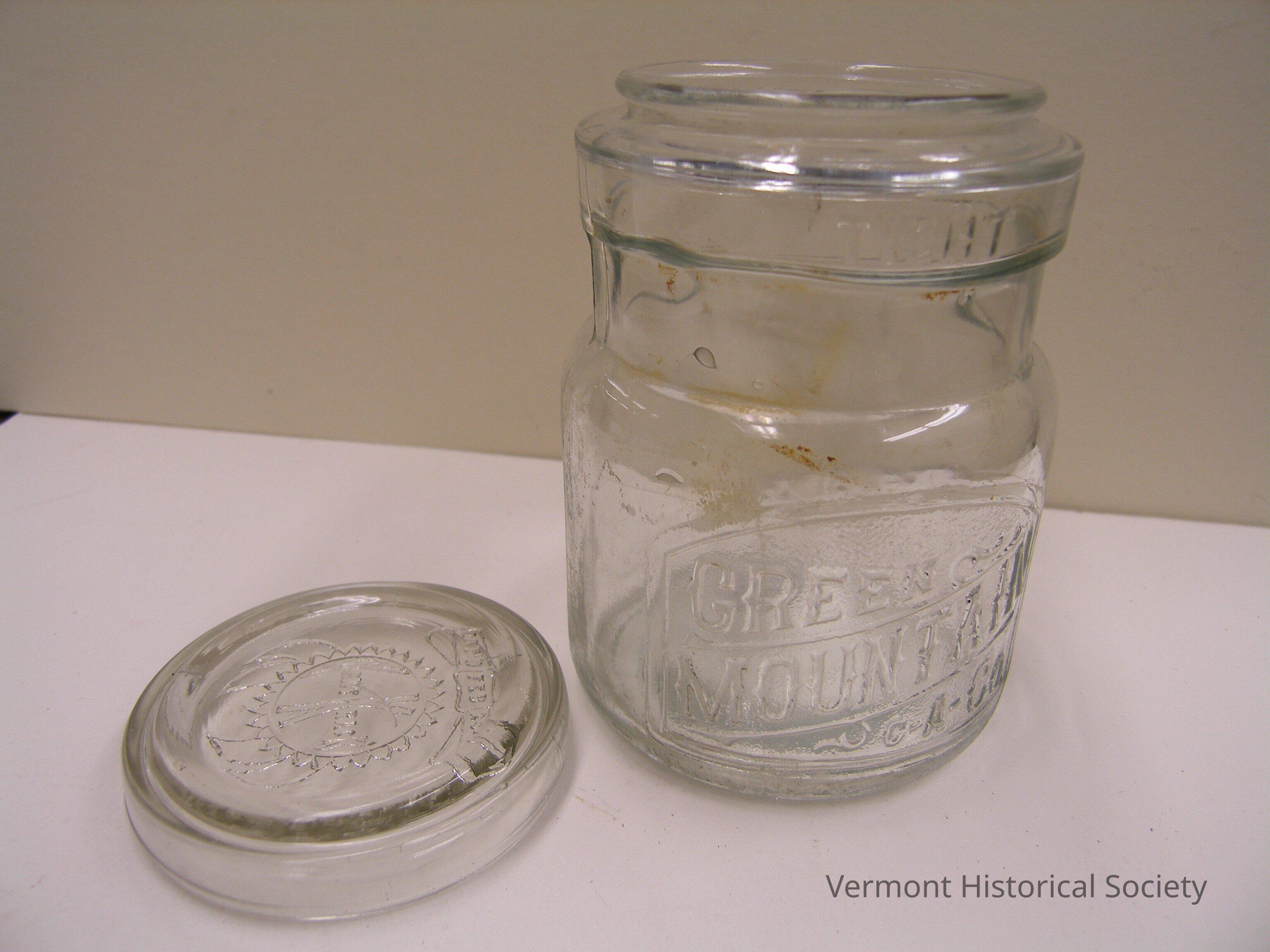 Clear glass jar and lid. (Glass has a greenish tint.) The jar is molded with the words, "Green Mountain C-A-Co." in decorative text. The collar of the jar is molded with the word "TIGHT" twice, at opposite sides. The glass lid is molded with a circular logo of a prize ribbon with the words, "Kant Krack" in the center and "Pat'd Feb 23-09" in a banner above the logo.