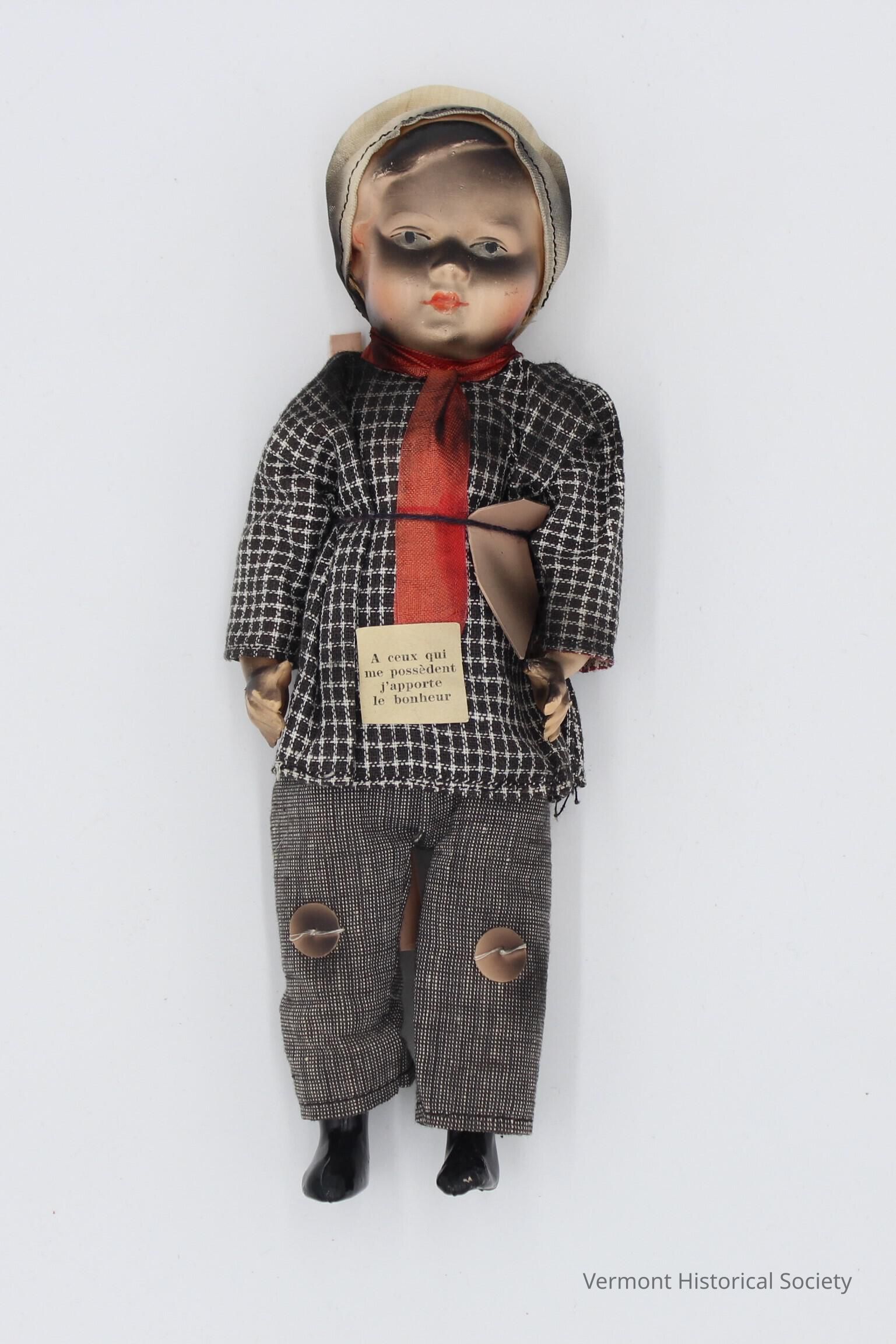 Male chimney sweep doll, painted to appear covered in soot. He is wearing a cloth around his head, a blue-and-white checkered shirt, red tie or cravat, pants with buttons representing knee pads, and black shoes. He has a ladder strapped onto his back. He is accompanied by a box impressed and painted to look like a chimney, a scale, and a pot. A small square piece of paper is attached to the front that reads, "A ceux qui me possédent j'apporte le bonheur".Context