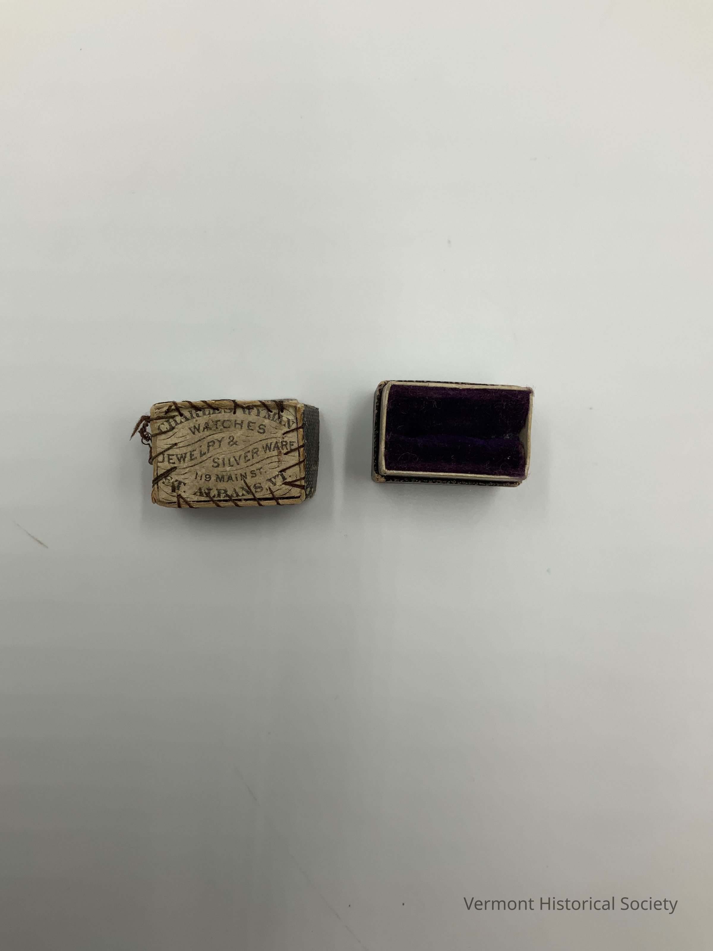 Small cardboard retail ring box consisting of a separate base and lid. The lid has been restitched together along the edges. The top of the lid is printed with the label, "CHARLES WYMAN WATCHES JEWELRY & SILVERWARE 119 MAIN ST. ST. ALBANS, VT."