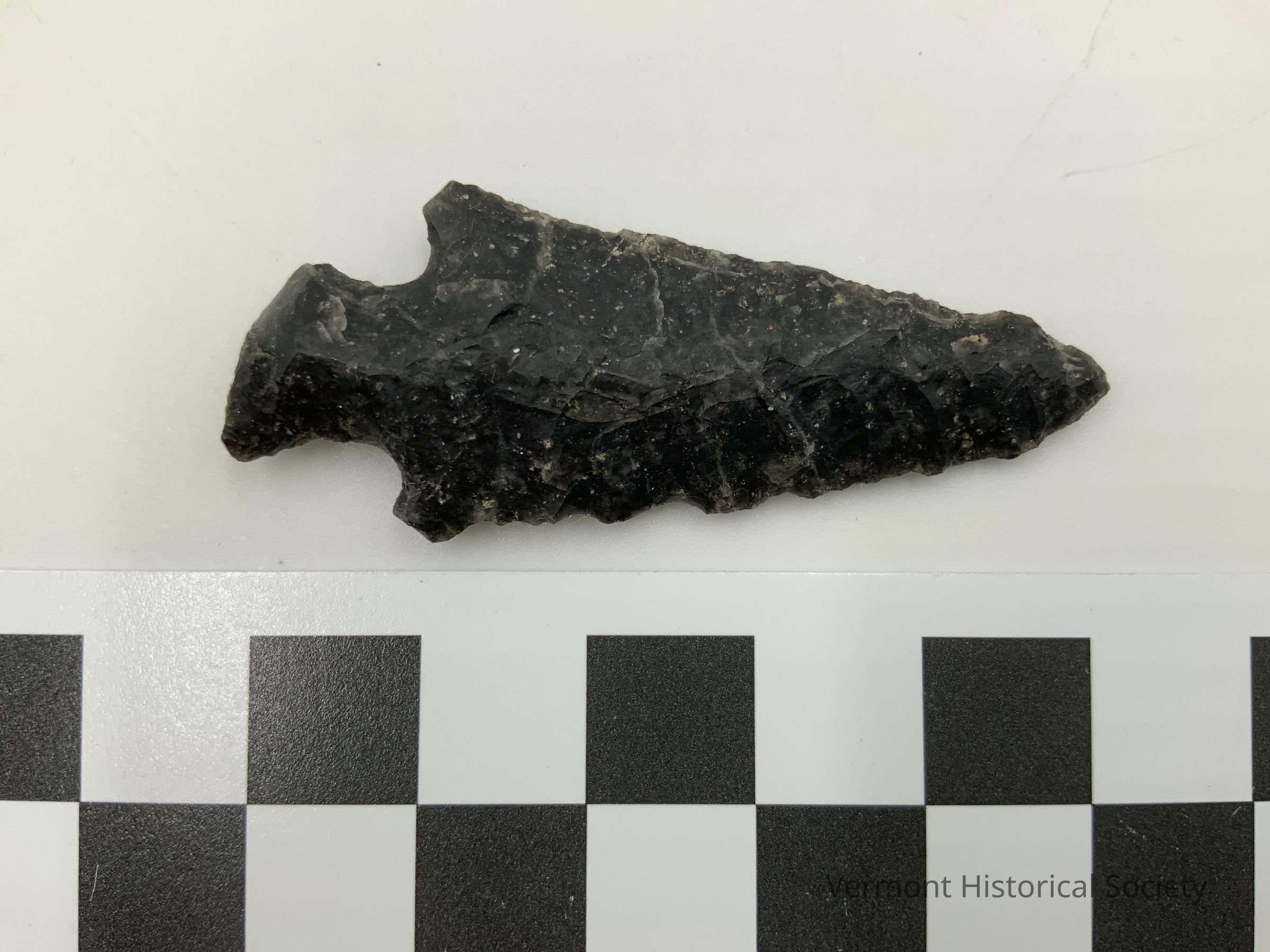 Black chipped stone projectile point with corner notches. It has bifacial secondary chipping and a straight base. It is symmetrical with straight, serrated blade edges and a bi-convex cross section.