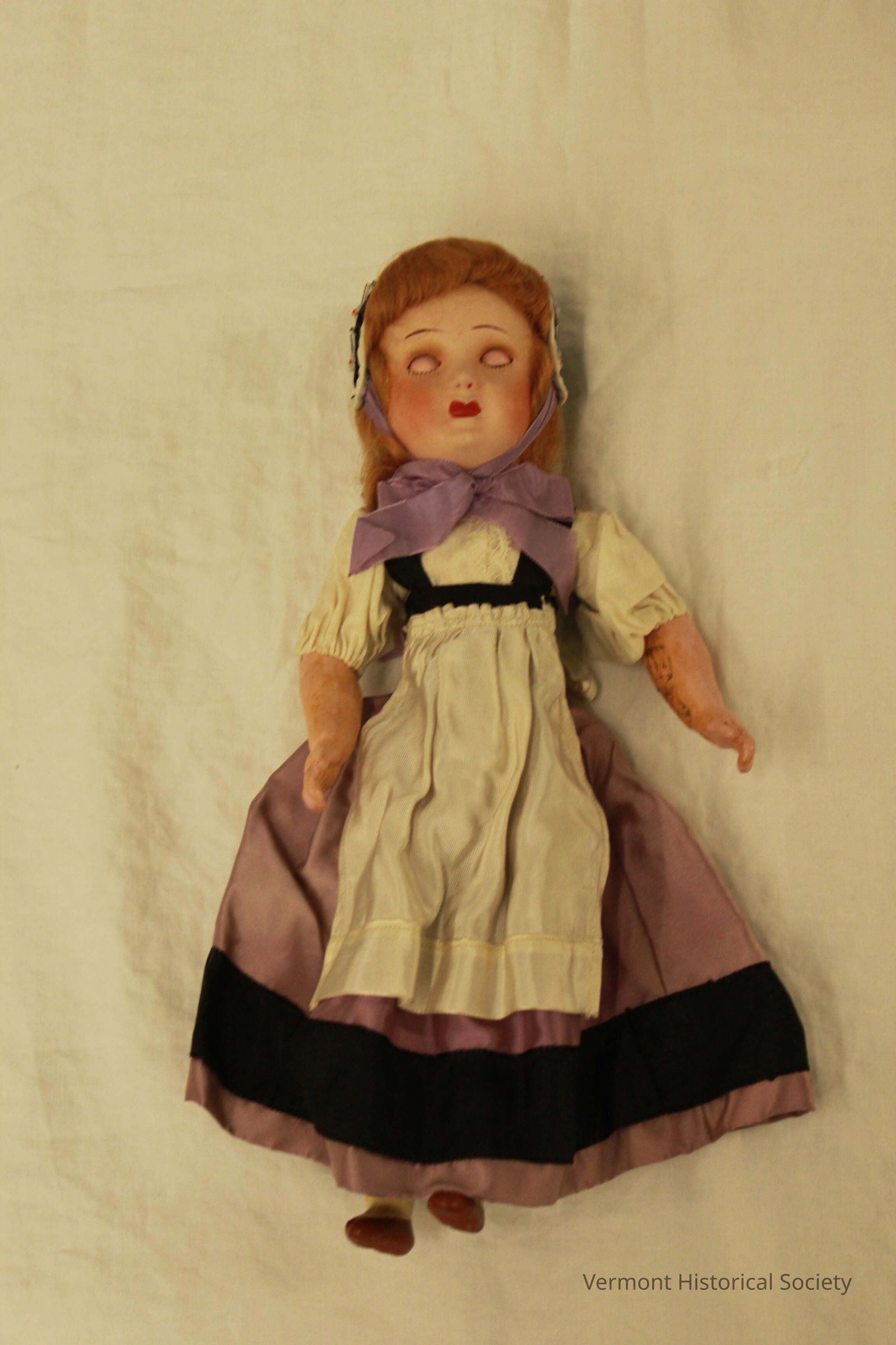 Doll in lilac skirt with black robbon border, with white apron and blouse, black velvet cap, red hairs, eyes that open, paint discolored and cracked on arms and legs.Context