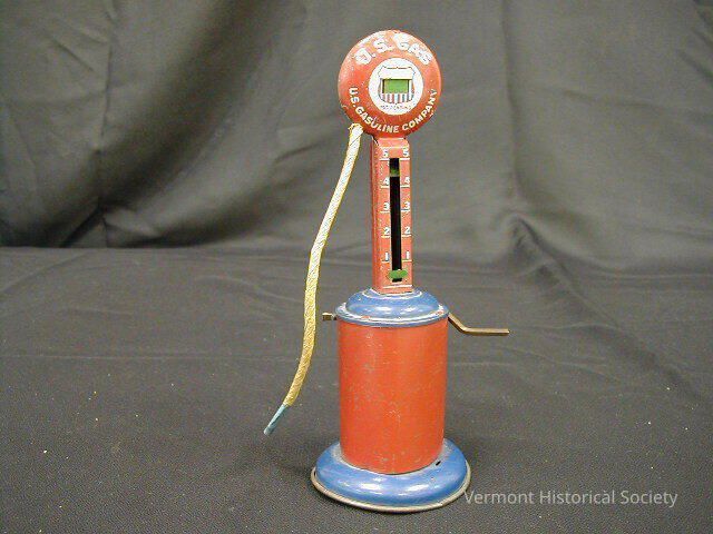 Miniature, metal toy gas pump. The pump consists of a cylindrical metal base, a hollow central gauge, a round top, a crank handle, and a hose. When the crank handle is turned, a marker within the gauge moves up and down. The top is labeled, "U.S. GAS / U.S. GASOLINE COMPANY".Context