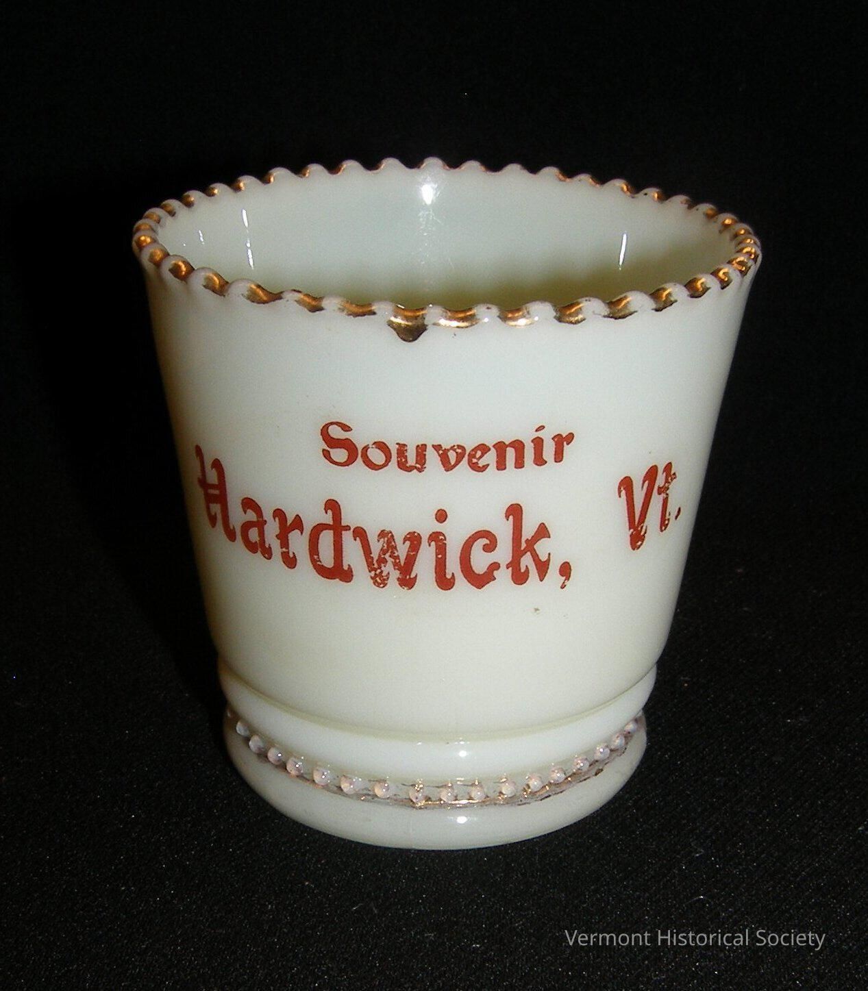 Custard glass toothpick holder. The cup flares outward from the base to the rim, and the top edge is gilded. One side is printed in red with the inscription, "Souvenir Hardwick, Vt."Acquisition