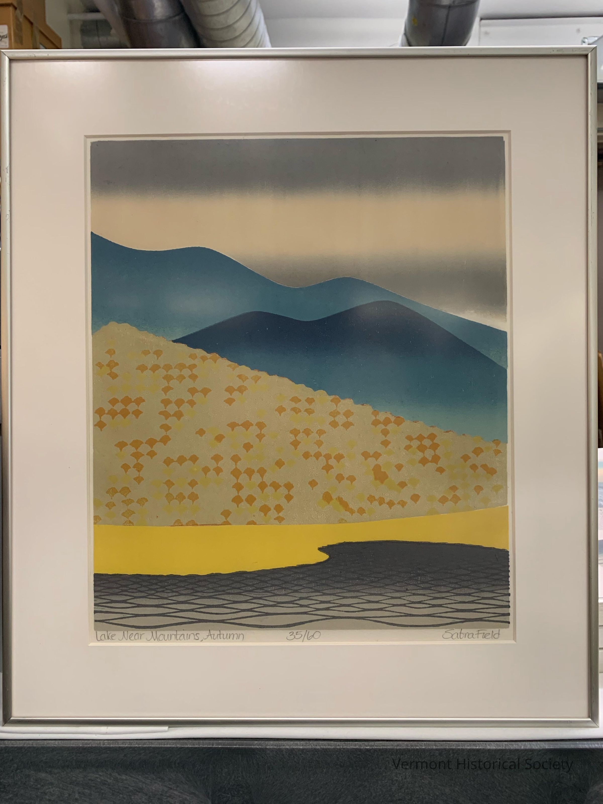 In 1982 Sabra Field was commissioned by IBM to produce four prints in celebration of 25 years at the Vermont plant. A limited run of 60 prints of each work was distributed to management and VIPs. A poster, including all four prints, IBMs logo with the word "Burlington" and a stylized 25 was produced in larger quantities for employees. The four prints depicted Vermont in four seasons. See objects 2021.42.1-5.