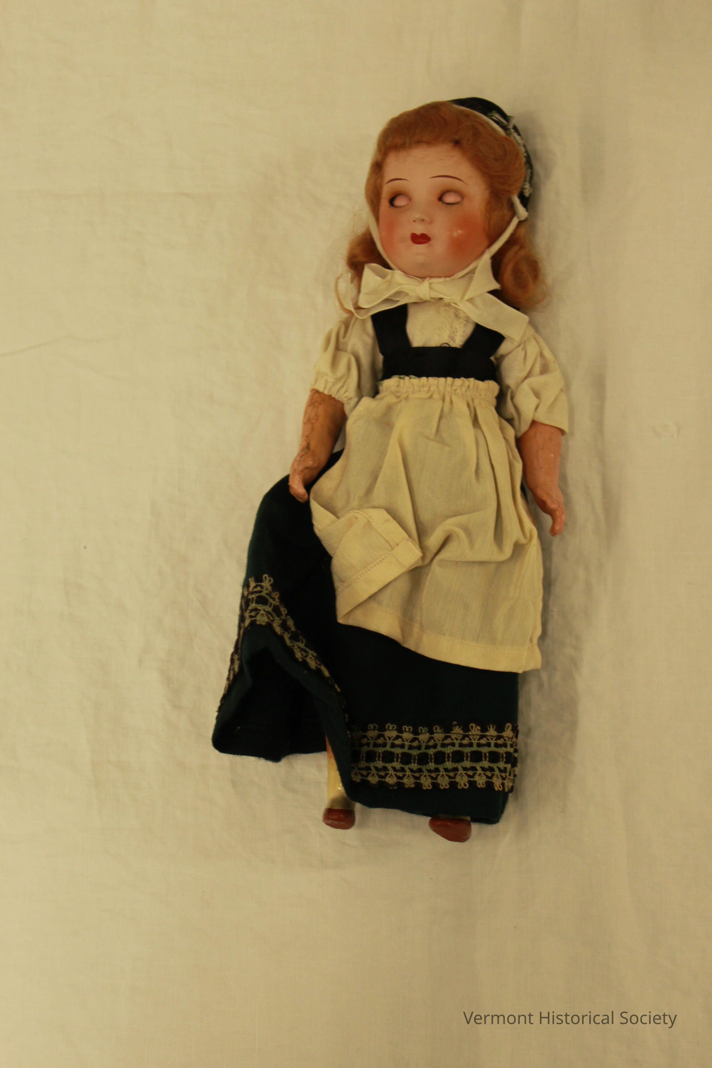Doll with automatically-closing eyes. The doll has red hair and painted face and limbs. She wears a black velvet hat tied with a white ribbon and a white apron over a white blouse and green wool skirt.Context