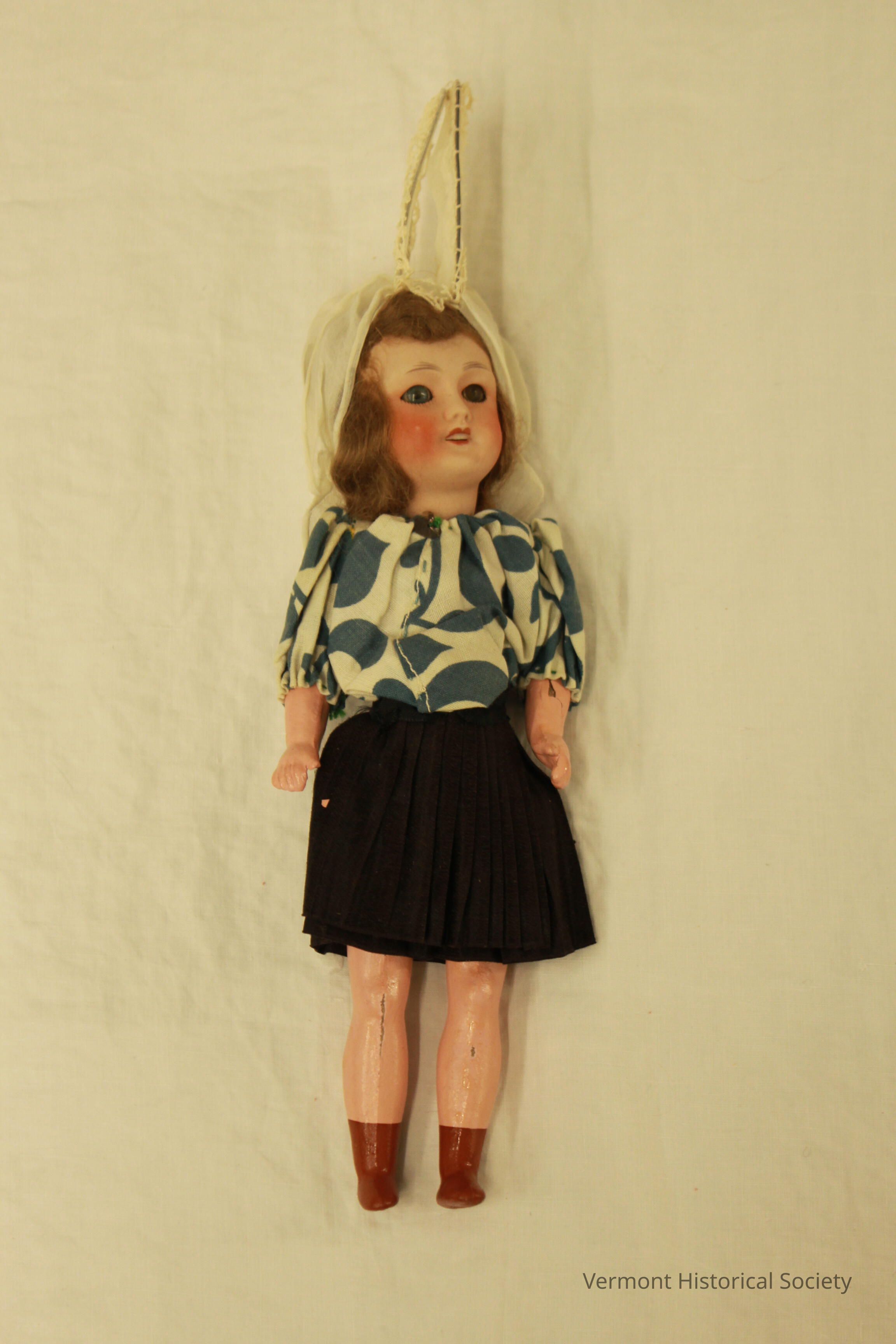 Doll in black skirt with blue/green and white patterned blouse, heart button, white headpiece with wire loops, red/brown hair, paint cracked on left arm and legs.Context