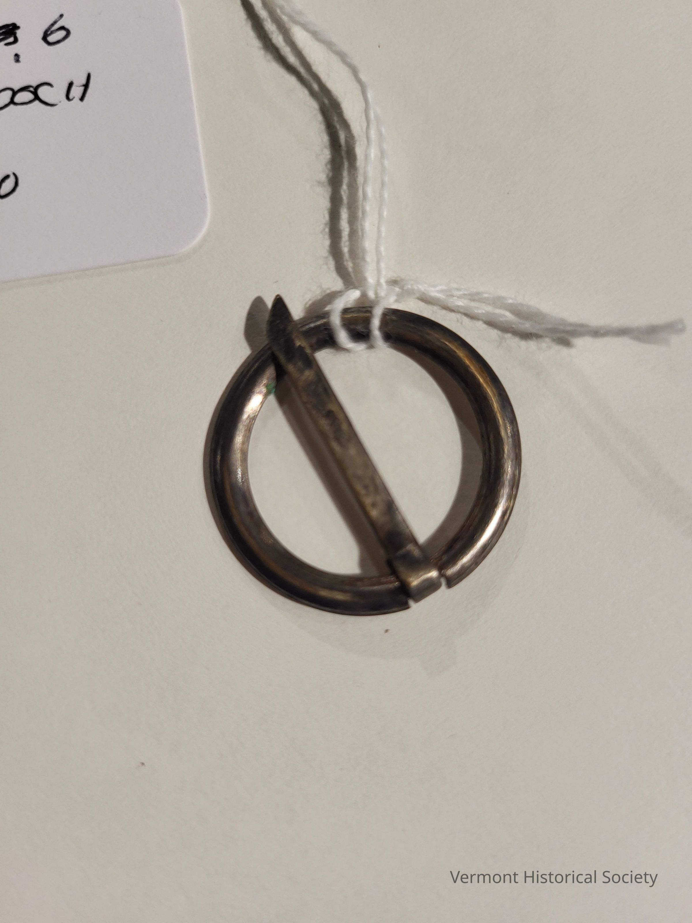 Wiseman states: This brooch, along with L2024.3.4-5 and L2024.3.7-8, were found in a Riker mount in the group shop, with a Western NH provenance and an assurance that they were solid coin silver and old. They were in almost pristine condition without much if any crinkling of the central prong. I worry that they were good repros, but they are not embossed “India” like many modern reproductions. They were full price, so I bought them for the provenance, but am unsure of their age, since trade silver is not my specialty.Acquisition
