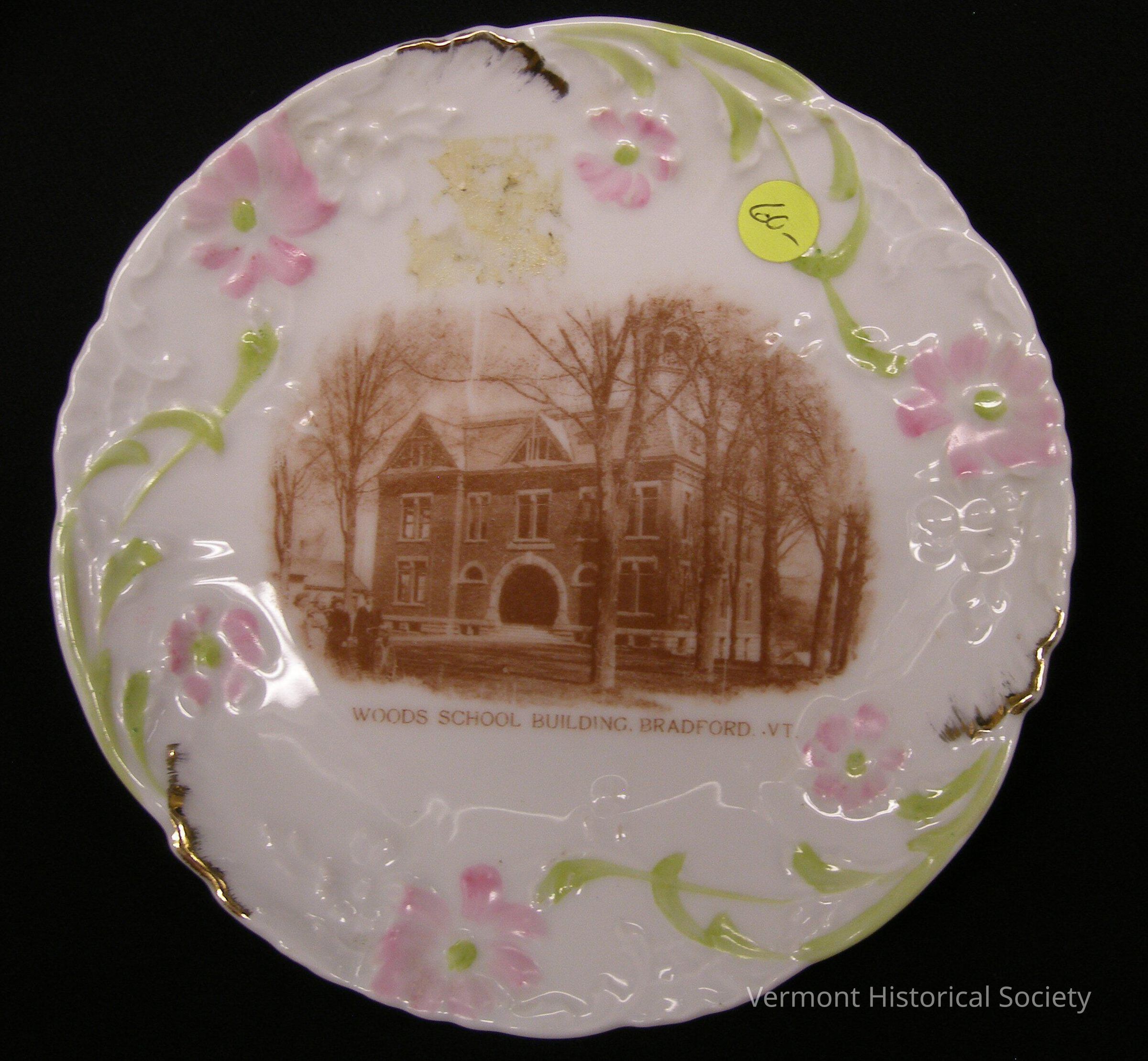 White ceramic saucer decorated around the edge with pink flowers and green leaves. The center is printed with a brown-toned photograph of a brick building with arched entryway. The image is labeled, "WOODS CHOOL BUILDING, BRADFOR, VT." The bottom of the dish is marked, "MADE IN GERMANY FOR PRICHARD & HAY BRADFORD, VT." and "Weimar Germany".Context