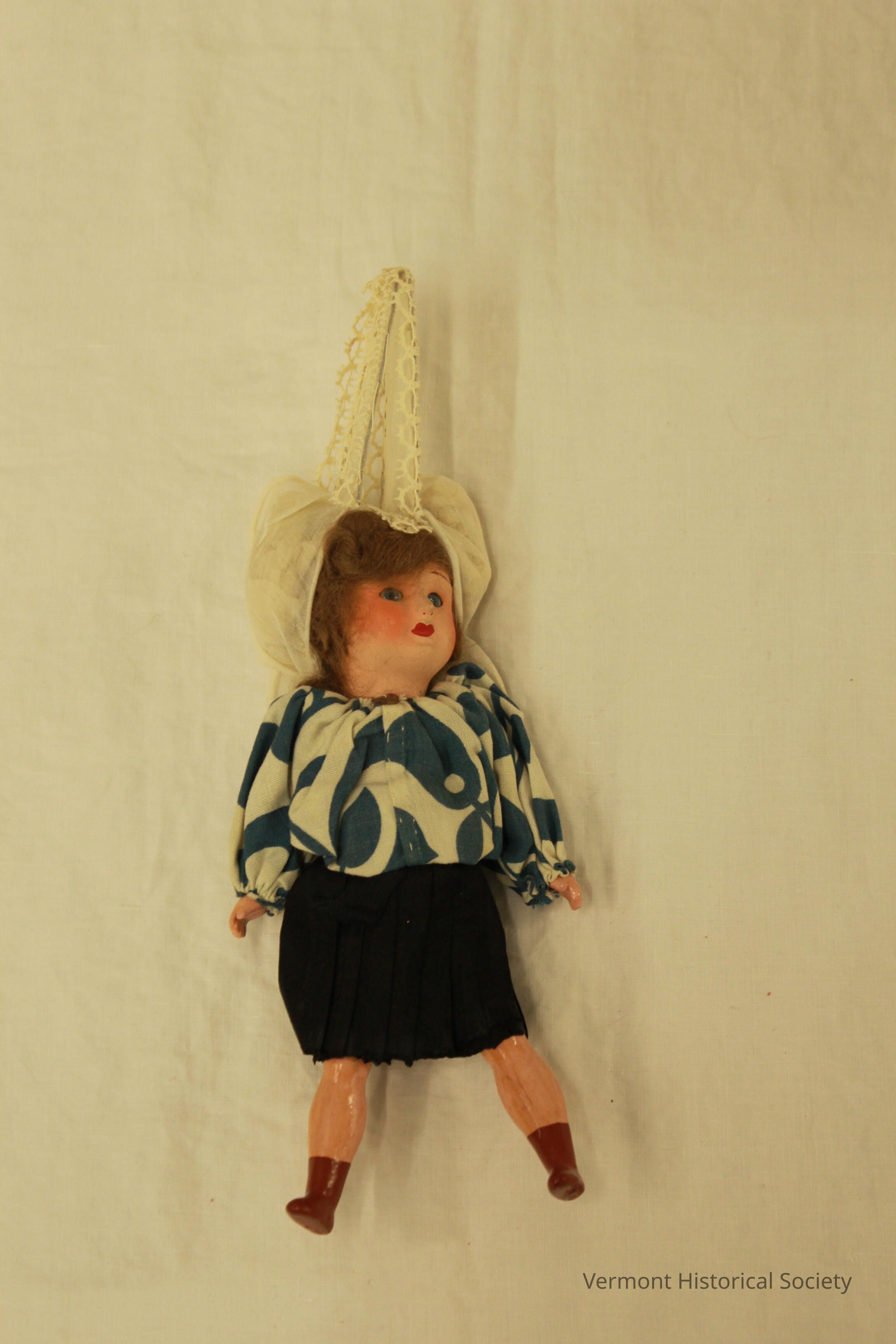 Doll in black skirt with blue/green patterned blouse, heart button, tall white headpiece with wire loops, red hair, black shoes found with doll and bagged.Context
