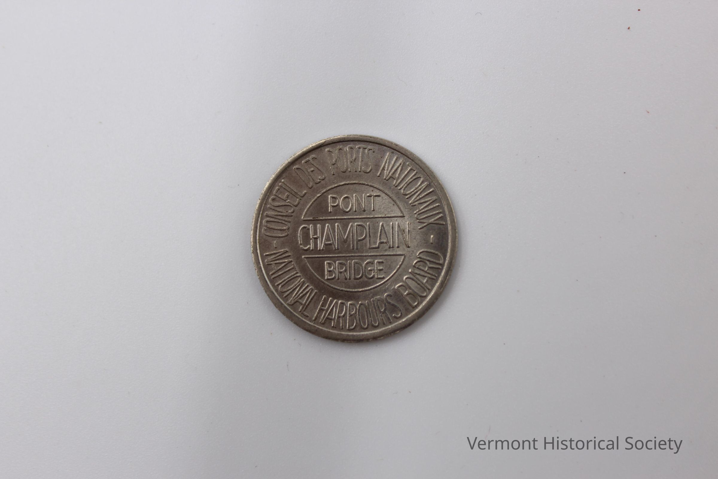 Silver-toned token used to cross the Pont Champlain Bridge. It bears the inscription, "CONSEIL DES PORTS NATIONAUX/NATIONAL HARBOURS BOARD" around the edge, and "PONT CHAMPLAIN BRIDGE" in the center on both sides.Context