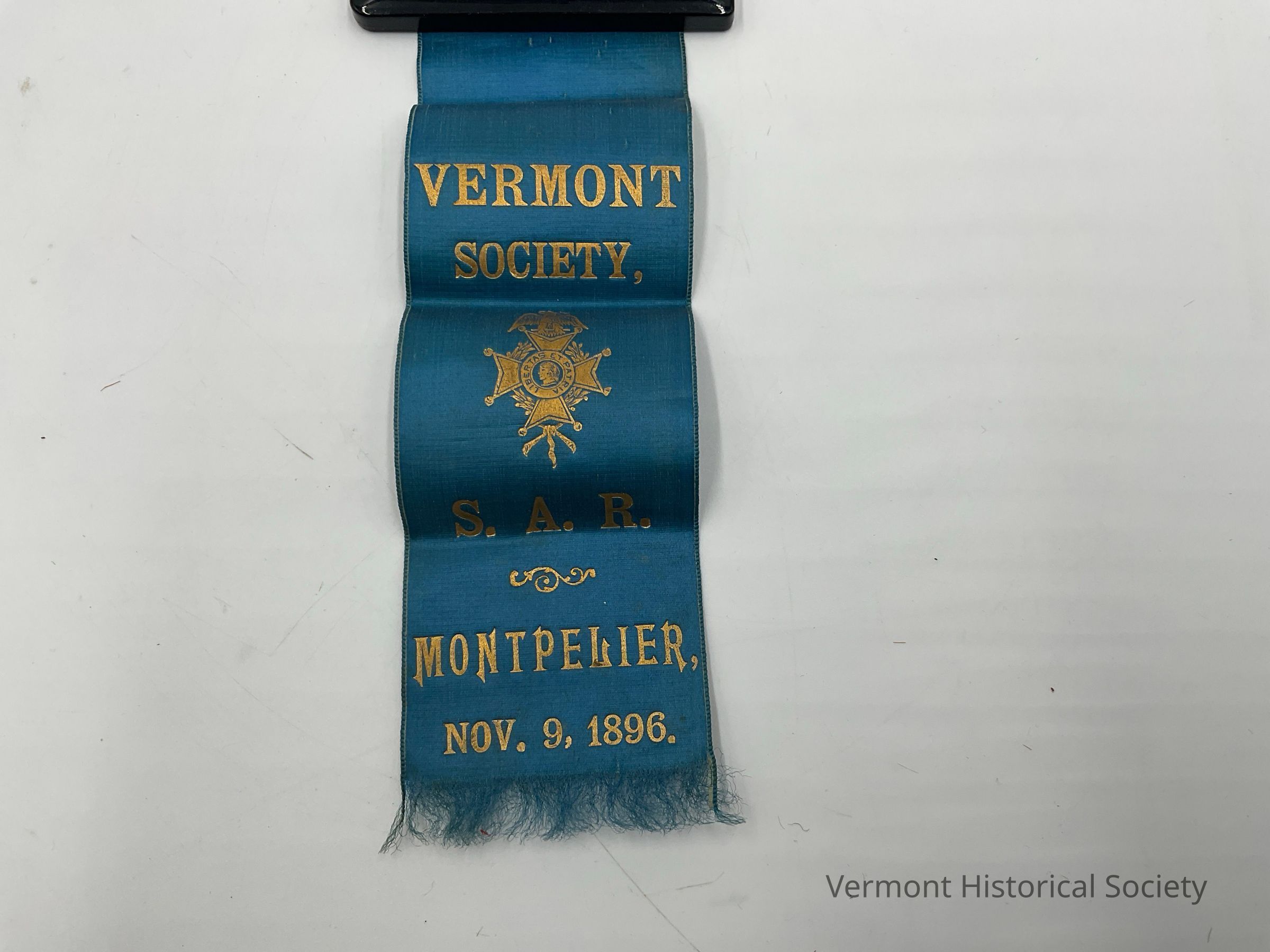 Blue and gold ribbon that says Vermont Society S.A.R. (Sons of the American Revolution) Montpelier, Nov. 9, 1896.Acquisition