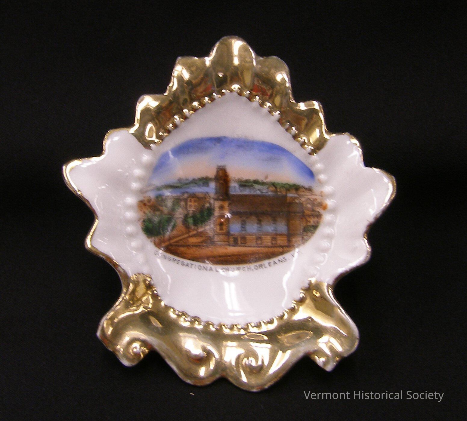 Candy dish in the shape of a leaf with gilding on the top and bottom rim. The center is printed with an aerial view of a large church building in a town. The image is labeled, "CONGREGATIONAL CHURCH, ORLEANS, VT." The bottom is marked, "MADE IN GERMANY FOR Whipple, French & Co. Orleans, Vt."Context