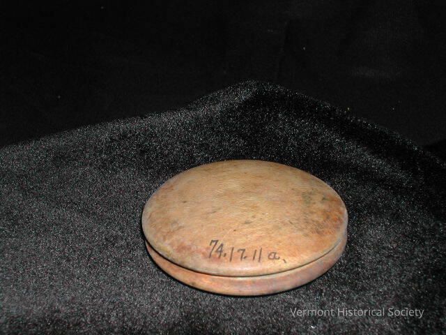Round wooden box with curved top & bottom. The interior has a scaling lining that has a powdering substance on it as well.