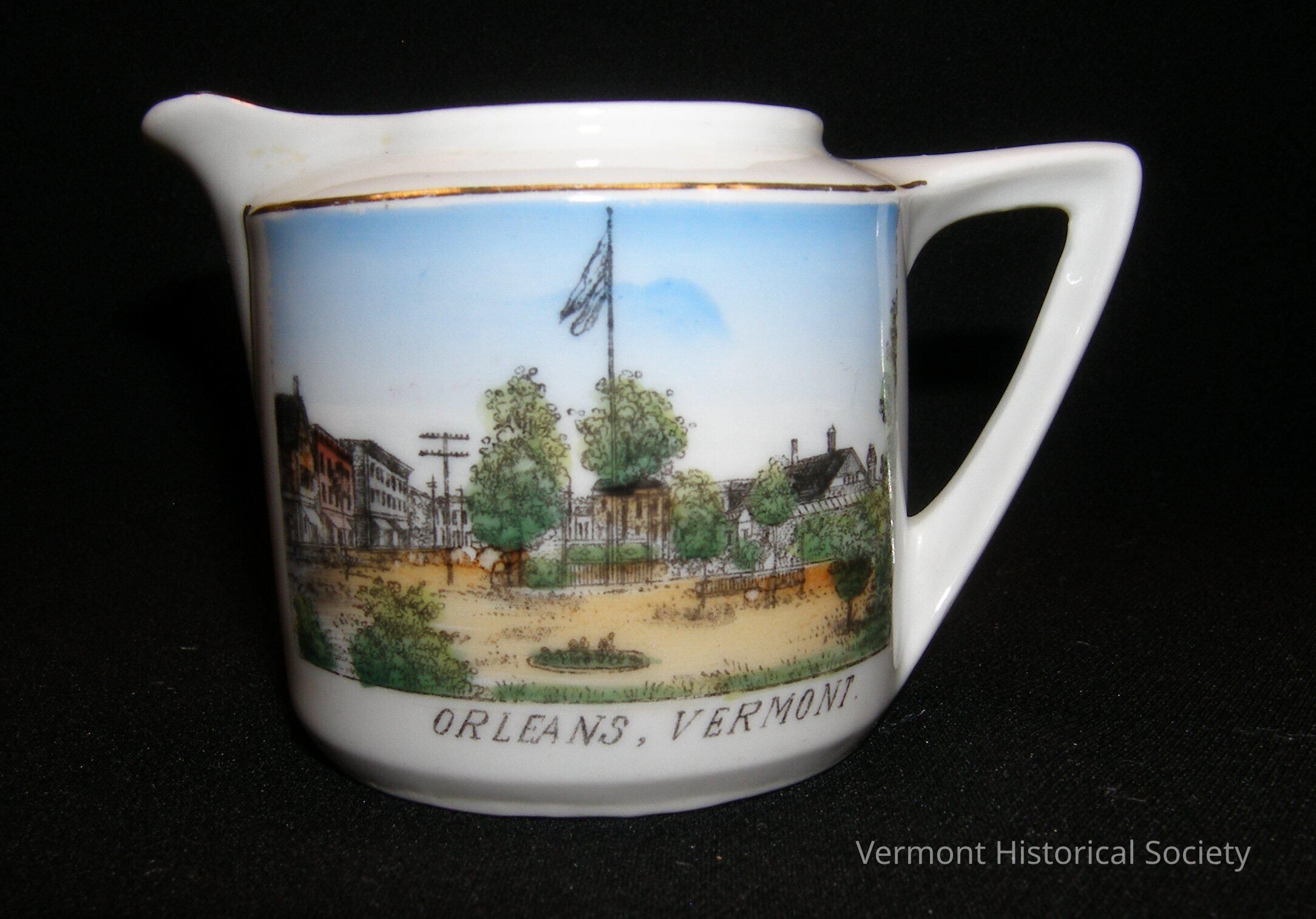 White porcelain cream pitcher. The pitcher is printed with a fully-colored illustration of park surrounded by city buildings. The park is painted to look like it is dirt or the grass is dead. The image is labeled, "ORLEANS, VERMONT." The bottom of the pitcher is marked, "Made in Germany for The Whipple-Converse Co. Orleans, Vermont."