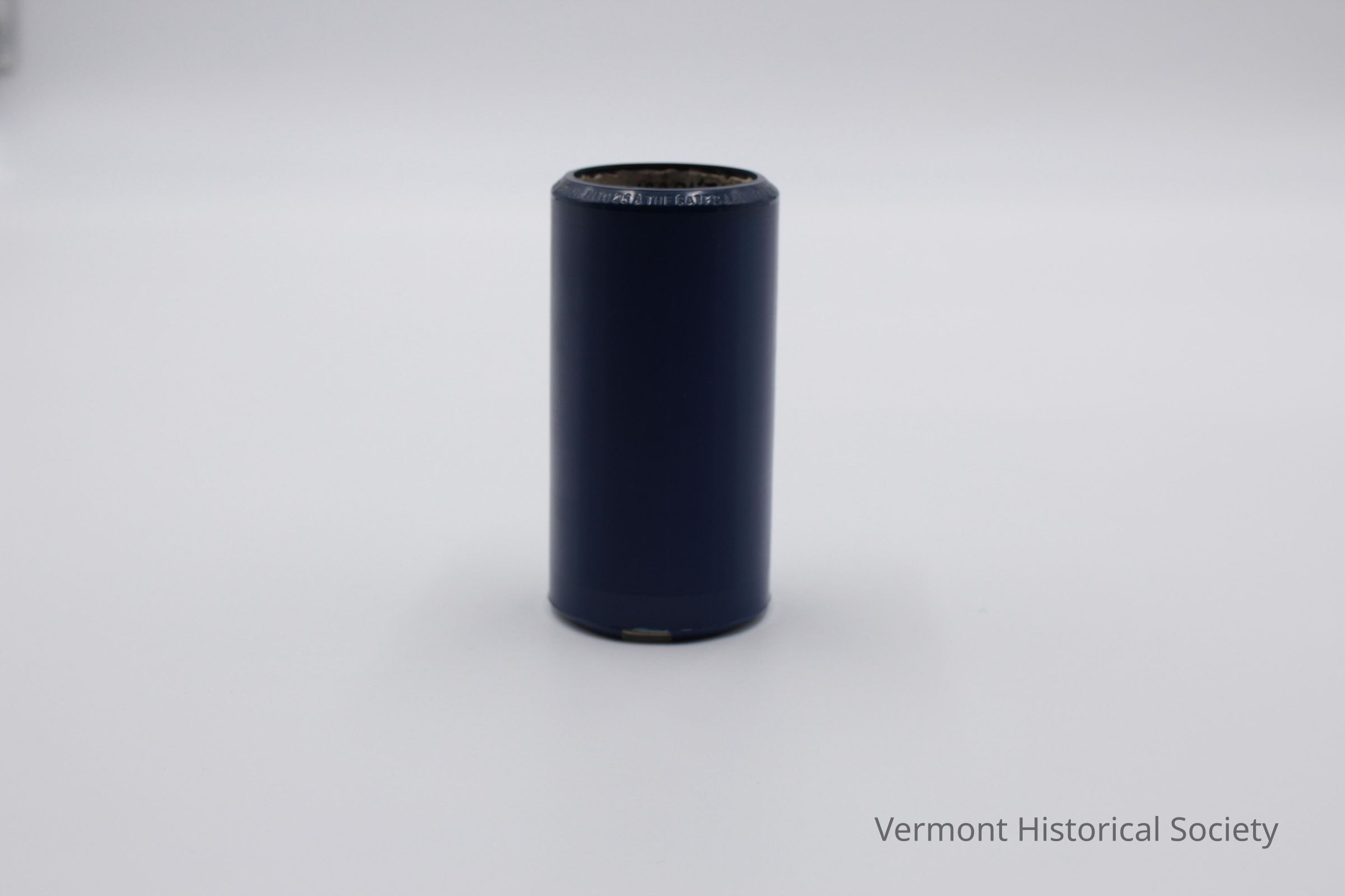 Blue phonograph cylinder with a cardboard case. The cylinder, or "record", is a hollow cylinder consisting of hard, blue, ridged celluloid around a concrete core. One edge of the cylinder is labeled in white with the words, "2219 REV. 21:21 TO 25 & THE GATES AJAR FOR ME. MADISON C. PETERS D.D. / Thomas A Edison PAT'D. 24".Use