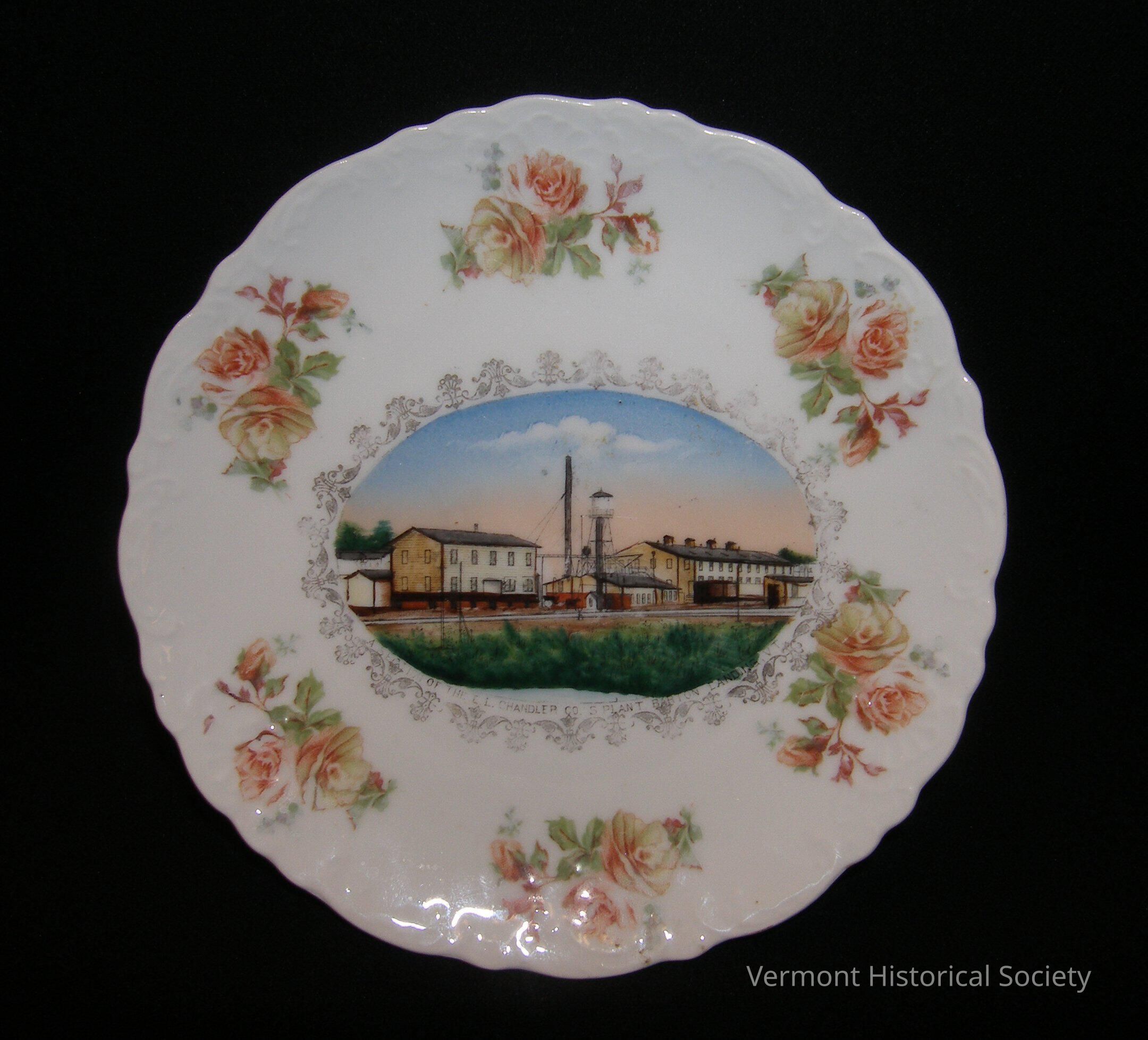 White ceramic saucer with full-color roses printed in around the rim. The center is printed with an illustration of several warehouse or factories along a railroad track. The image is labeled, "A Section of the E. L. Chandler Co. S Plant, Barton Landing, Vt." The back of the saucer is marked, "WHEELOCK VIENNA AUSTRIA Made in Austria for Whipple, French & Co., Barton Landing, Vt. Vienna."Context
