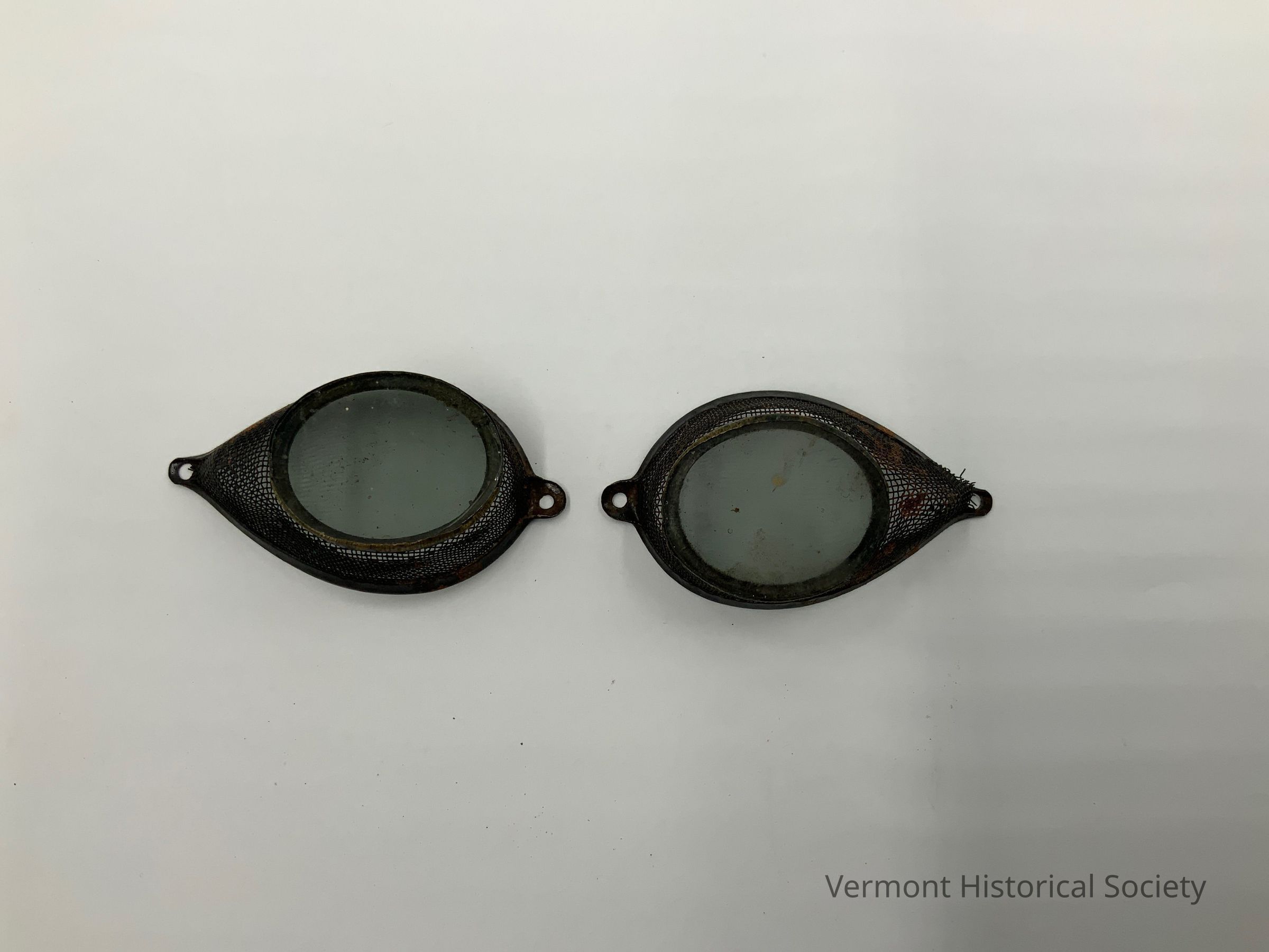 Safety goggles consisting of oval, clear glass lenses surrounded by shaped, metal mesh cage-like frames. Each lens is framed separately and has eyelets at each end, to secure a bridge and temples, or head strap.Context