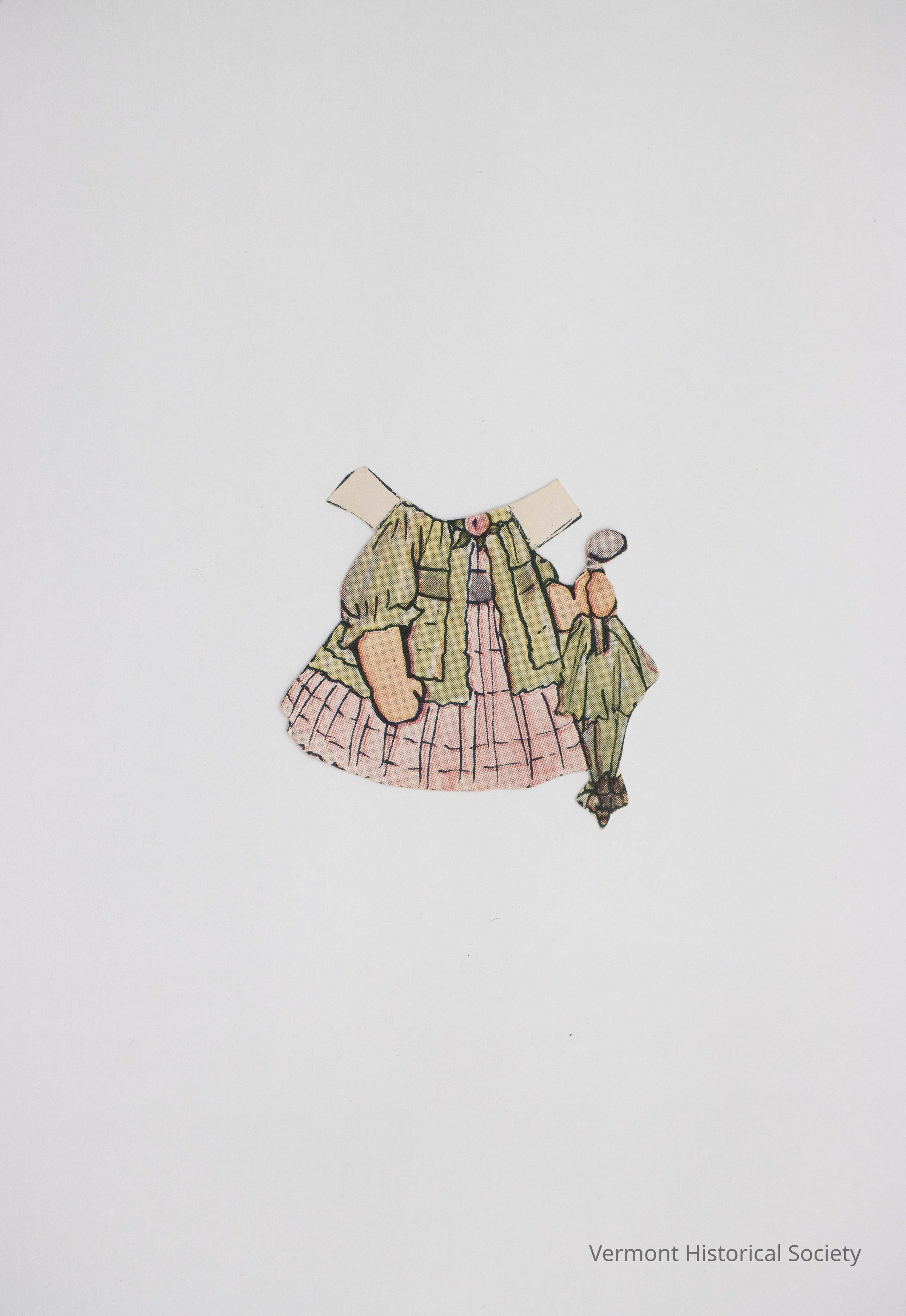 Printed paper dress for a paper doll. The dress is pink and accessorized with a short green jacket and green umbrella.Context