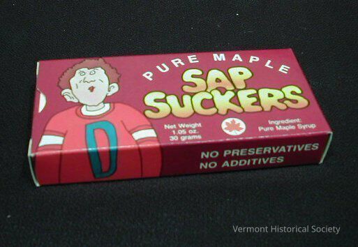 Printed cardboard box for maple candy. The box is printed with a dark red background and features a cartoon figure with short brown hair, puckered lips, and a bright red sweater with white bands around each upper arm and a large turquoise "D" on the front. Beside the figure are the words, "PURE MAPLE / SAP SUCKERS" in white and yellow/orange lettering. There are additional words about the weight and contents of the candy inside below the main text and on the back of the box.Acquisition