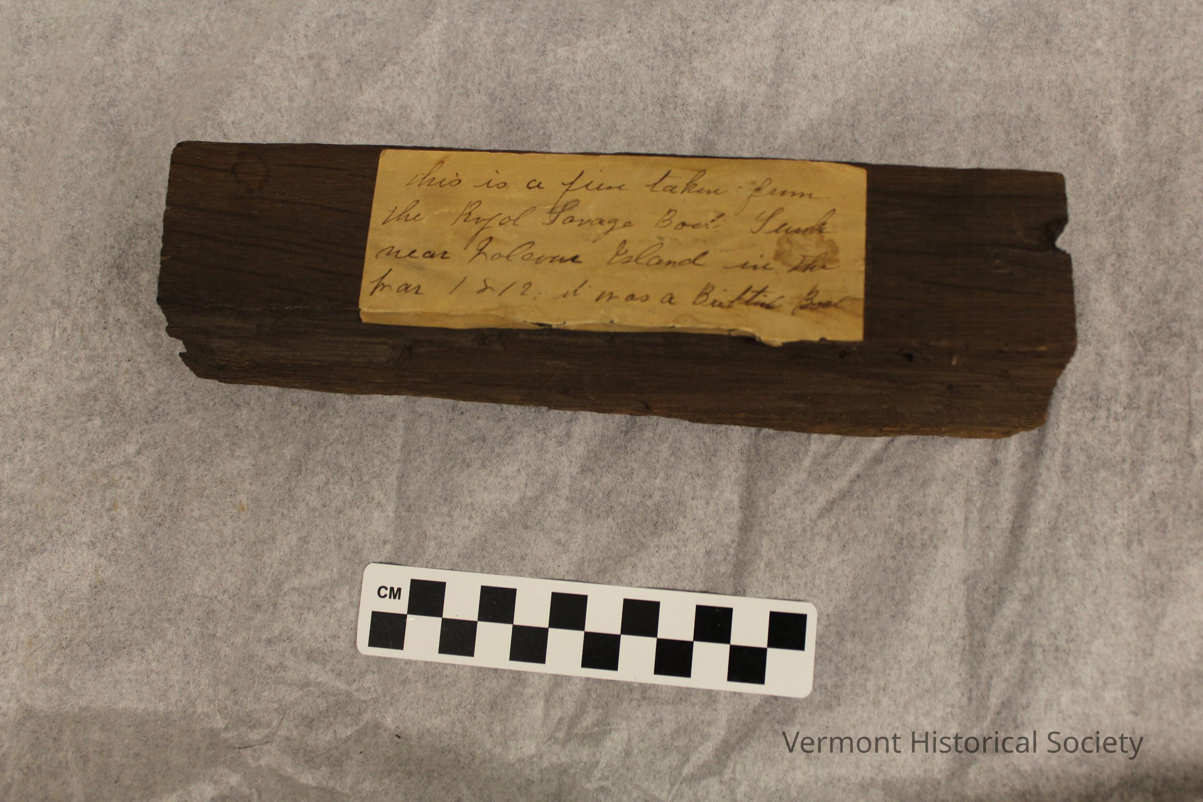 Small, rectangular wooden beam. One side is pasted with a yellowed piece of paper with the handwritten inscription, "this is a piece taken from the Royal Savage Boat Sunk near Valcour Island in the Mar 1812; it was a Brittish Boat". [The information is incorrect.]Context