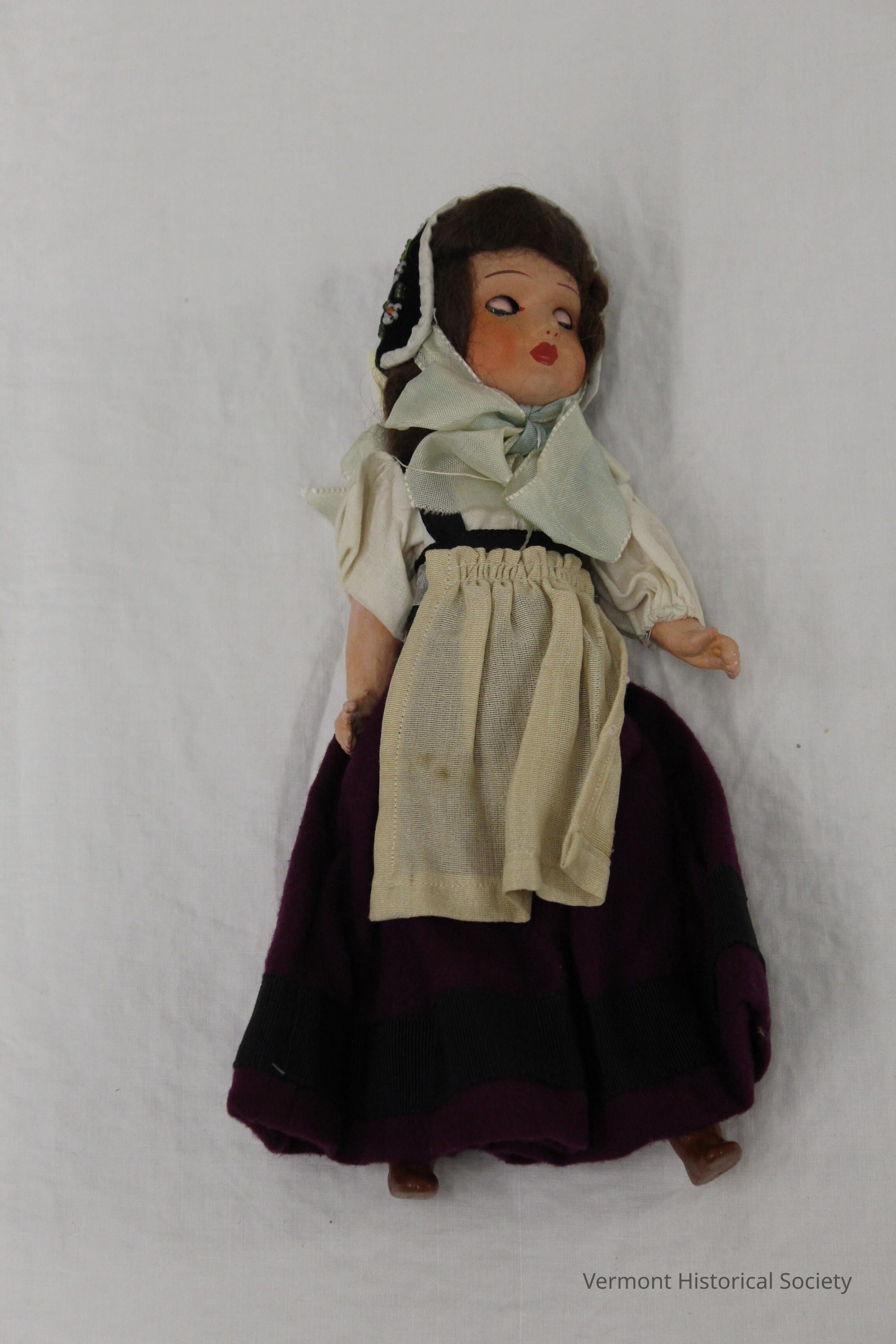 Doll in purple skirt with black ribbon trim, cream apron and blouse, black velvet cap with light blue ribbon tie, brown hair. Paint cracked on legs.Context