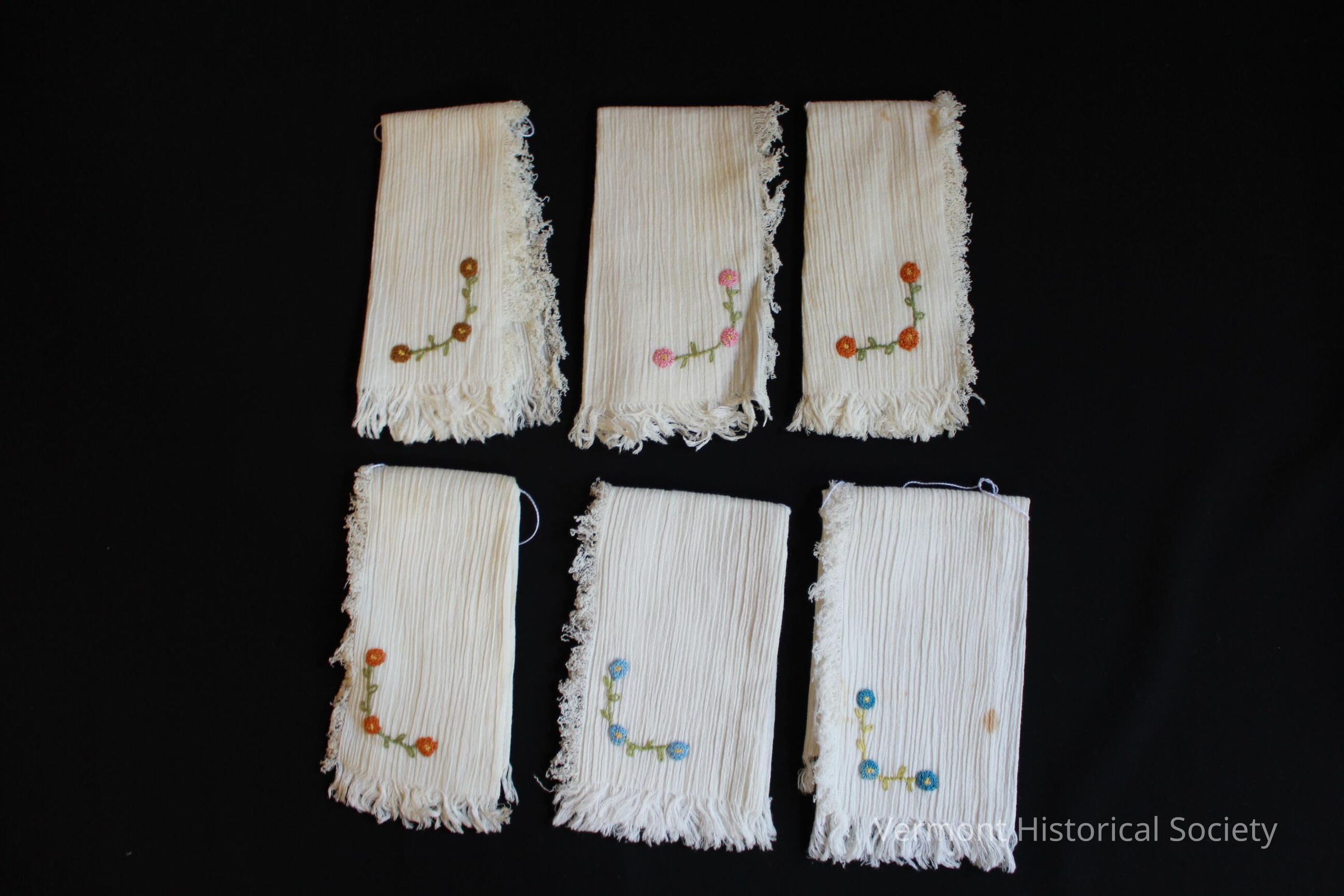 Set of 6 white crepe table mats. Each is embroidered in one corner with a simple design of 3 flowers on a single stem. There is fringe on all 4 sides.