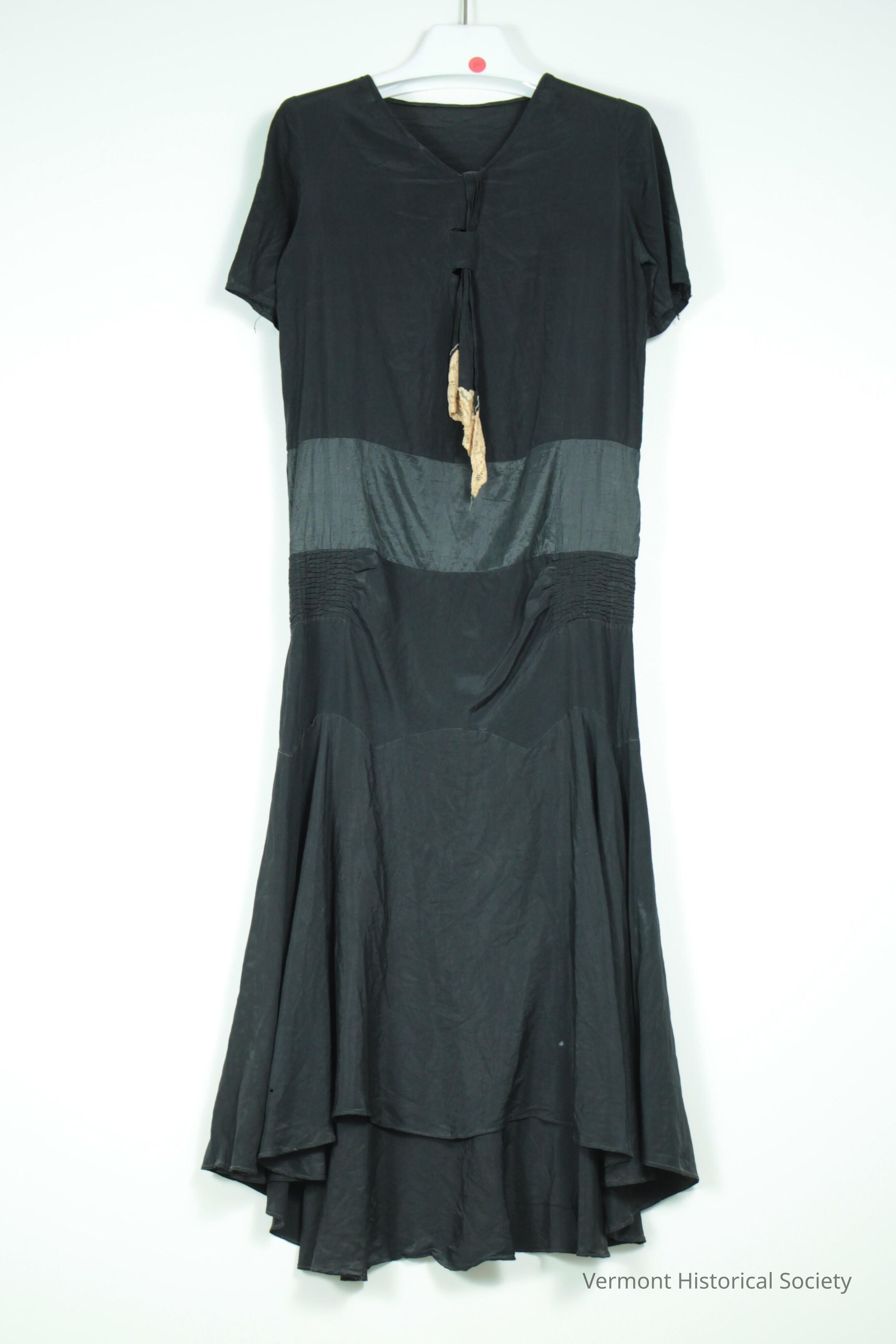 Black silk or rayon crepe dress with dropped waist and smocking at the hips. There is a horizontal stripe at the waist of black satin, and the skirt attaches to the bodice below the hips in a handkerchief style scalloped line. The hem is lower in the back than in the front. The neckline has a self-fabric faux tie trimmed in lace that thread through two slits in the bodice.Context