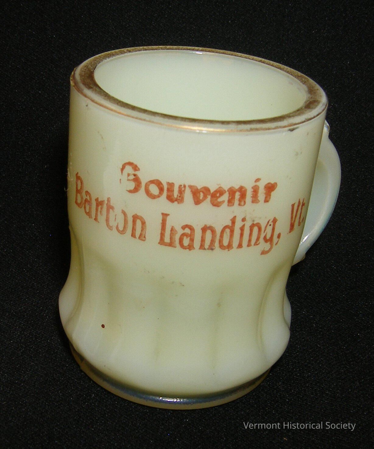 Custard glass toothpick holder in the shape of a beer stein. The cup is printed with the red inscription, "Souvenir Barton Landing, Vt."