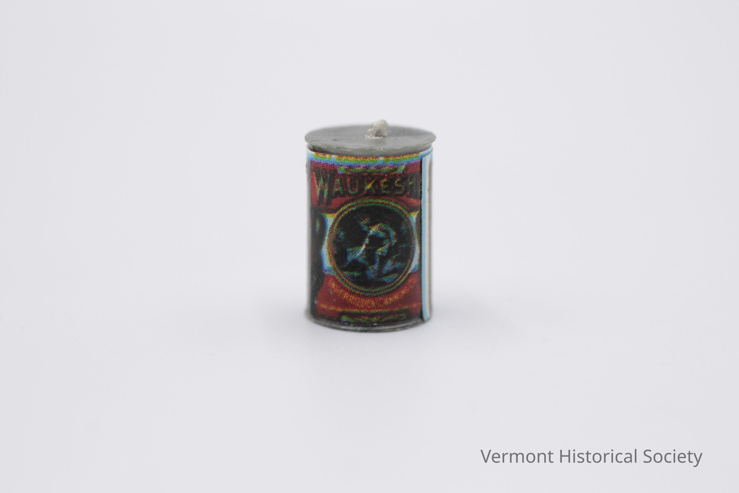 Miniature cylindrical food-storage can. The can is made of silver-colored plastic and is wrapped with a printed paper label. One side of the paper label shows a round medallion with the word, "WAUKESHA". The other side shows a tureen of soup with the words, "WAUKESHA BRAND GREEN PEAS".Context