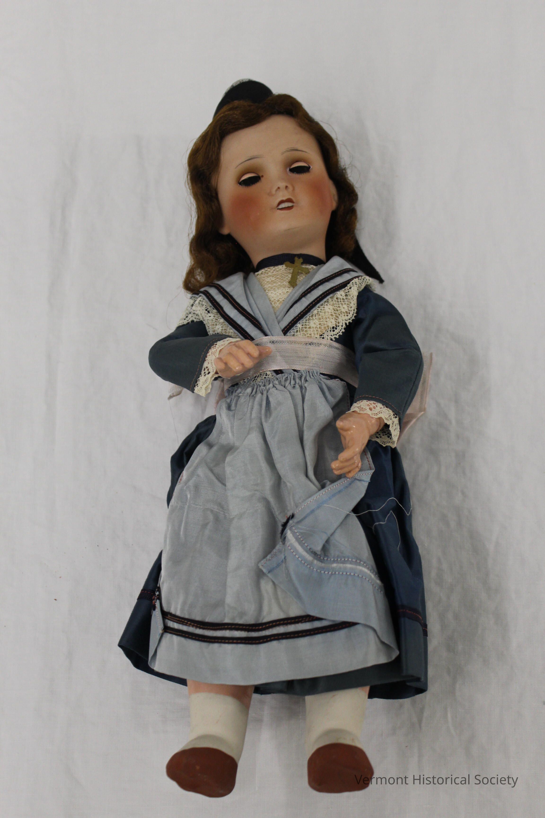 Doll in blue dress and light blue apron with dark striped border, lace cuffs, cross at neck, pink ribbon at waist, brown hair which falls off the head, small black cap, moveable arms.Context
