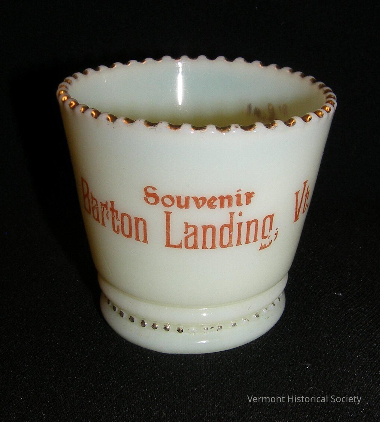 Custard glass toothpick holder. The cup flares outward from the base to the rim, and the top edge is gilded. One side is printed in red with the inscription, "Souvenir Barton Landing, Vt."Acquisition