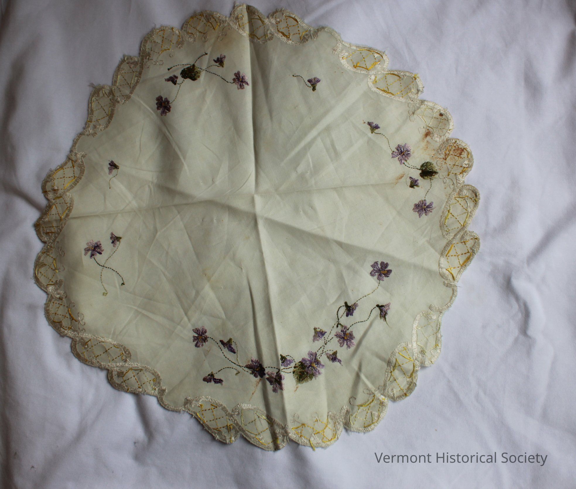 Round linen table mat embroidered with purple floral buds and a gold basketwork edge.