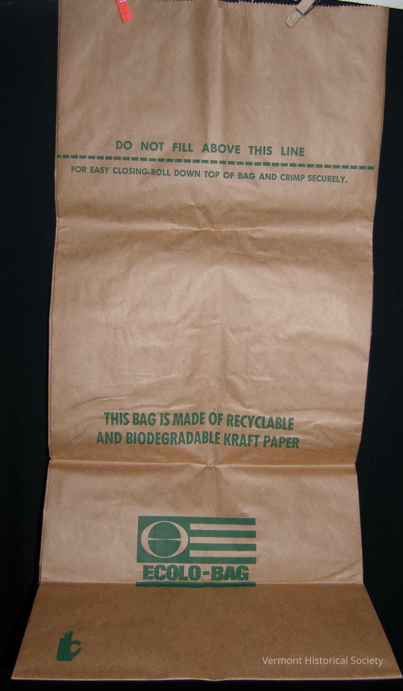 Large, brown paper trash bag. The bag is printed in green ink with a dashed line near the top and the inscription, "DO NOT FILL ABOVE THIS LINE / FOR EASY CLOSING-ROLL DOWN TOP OF BAG AND CRIMP SECURELY". Near the bottom are the words, "THIS BAG IS MADE OF RECYCLABLE AND BIODEGRADABLE KRAFT PAPER" and the logo for Ecolo-bag.