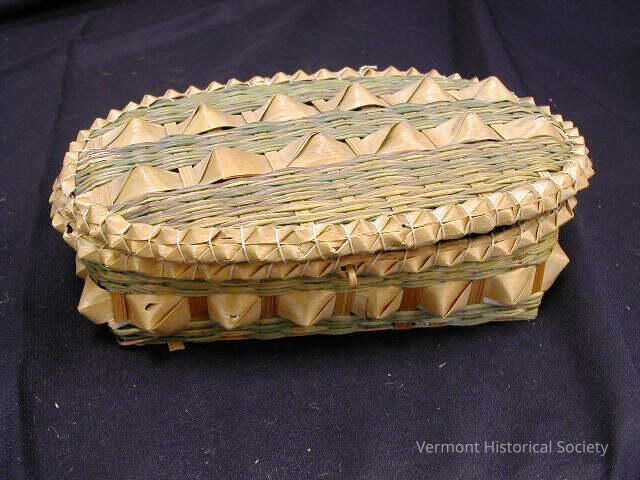Oval basket with cover. The cover is hinged with two small strips of willow. The basket sides and the center of the lid are decorated with woven loops, or cowis.Context