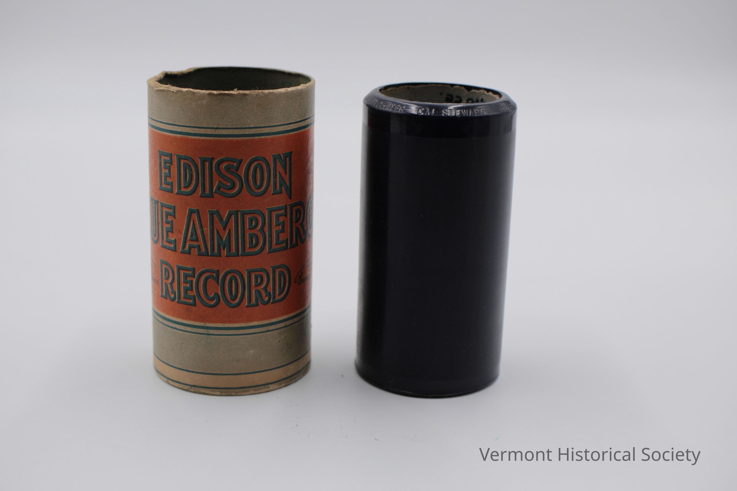 Black phonograph cylinder with a cardboard case. The cylinder, or "record", is a hollow cylinder consisting of hard, blue, ridged celluloid around a concrete core. One edge of the cylinder is labeled in white with the words, "1507 TOWN TOPICS OF PUMPKIN CENTER CAL STEWART / Thomas A Edison PAT'D. 24."Use