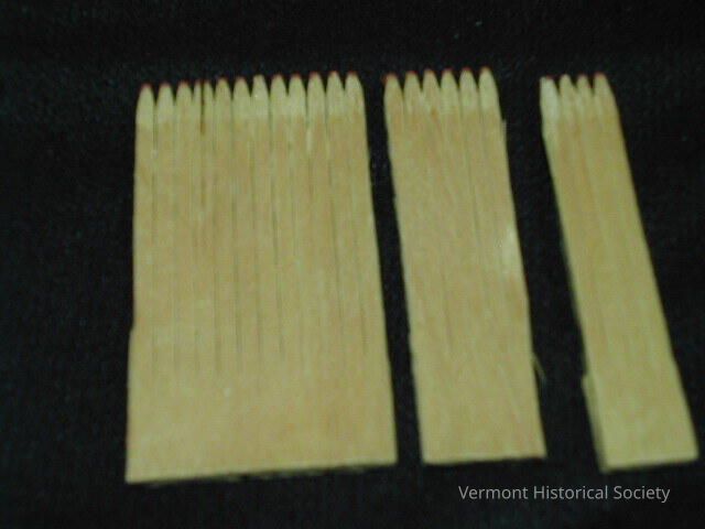 Wooden stick matches. The matches are partially split, with a small uncut portion at the bottom. The other ends are tapered and tipped with a red substance.