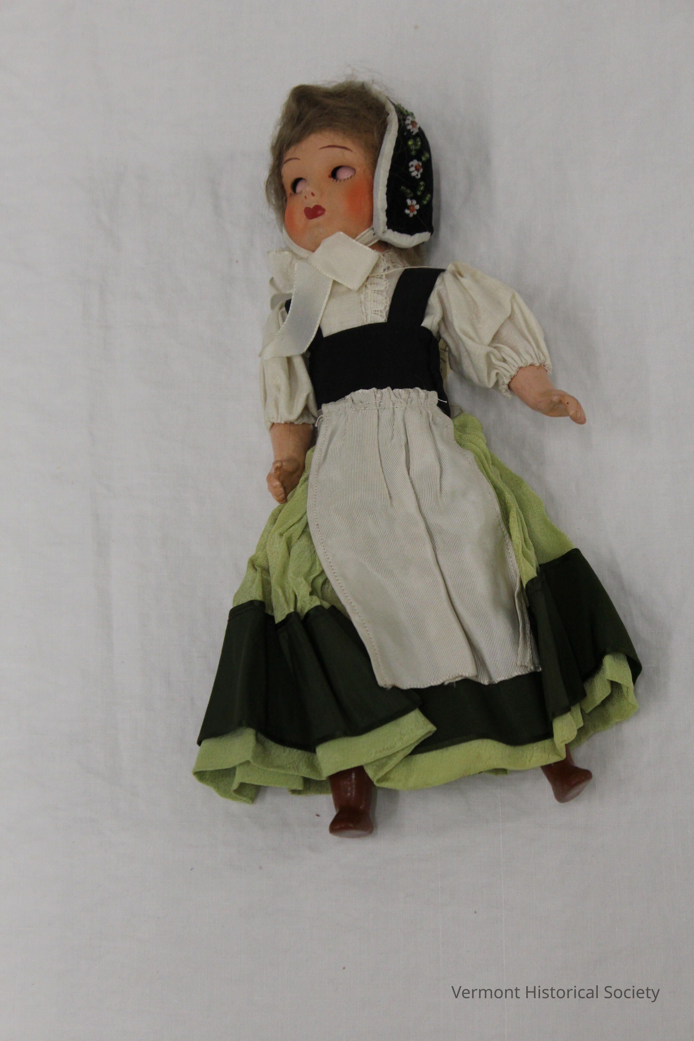 Doll in celery green skirt with dark green ribbon border, cream apron and blouse, black velvet cap tied with white ribbon, brown hair, paint chipped and cracked on legs.Context