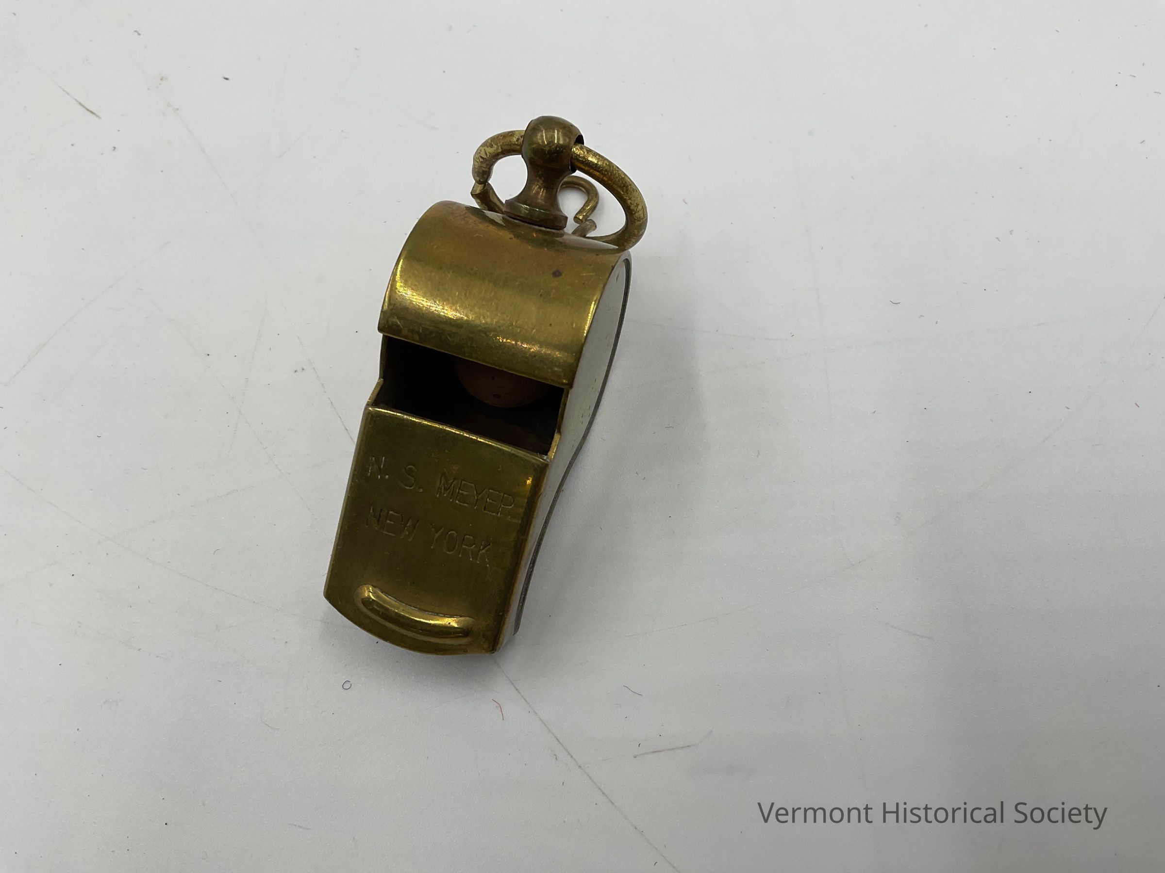 c = gold-colored whistle with a ring. On the top side: "N.S. Meyer, New York." On the underside: "Made in the U.S.A."