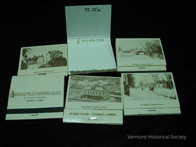 Souvenir matchbooks. Each matchbook has the label, "Lyndonville Savings Bank" on one side, and a view of Lyndonville on the other side.Context