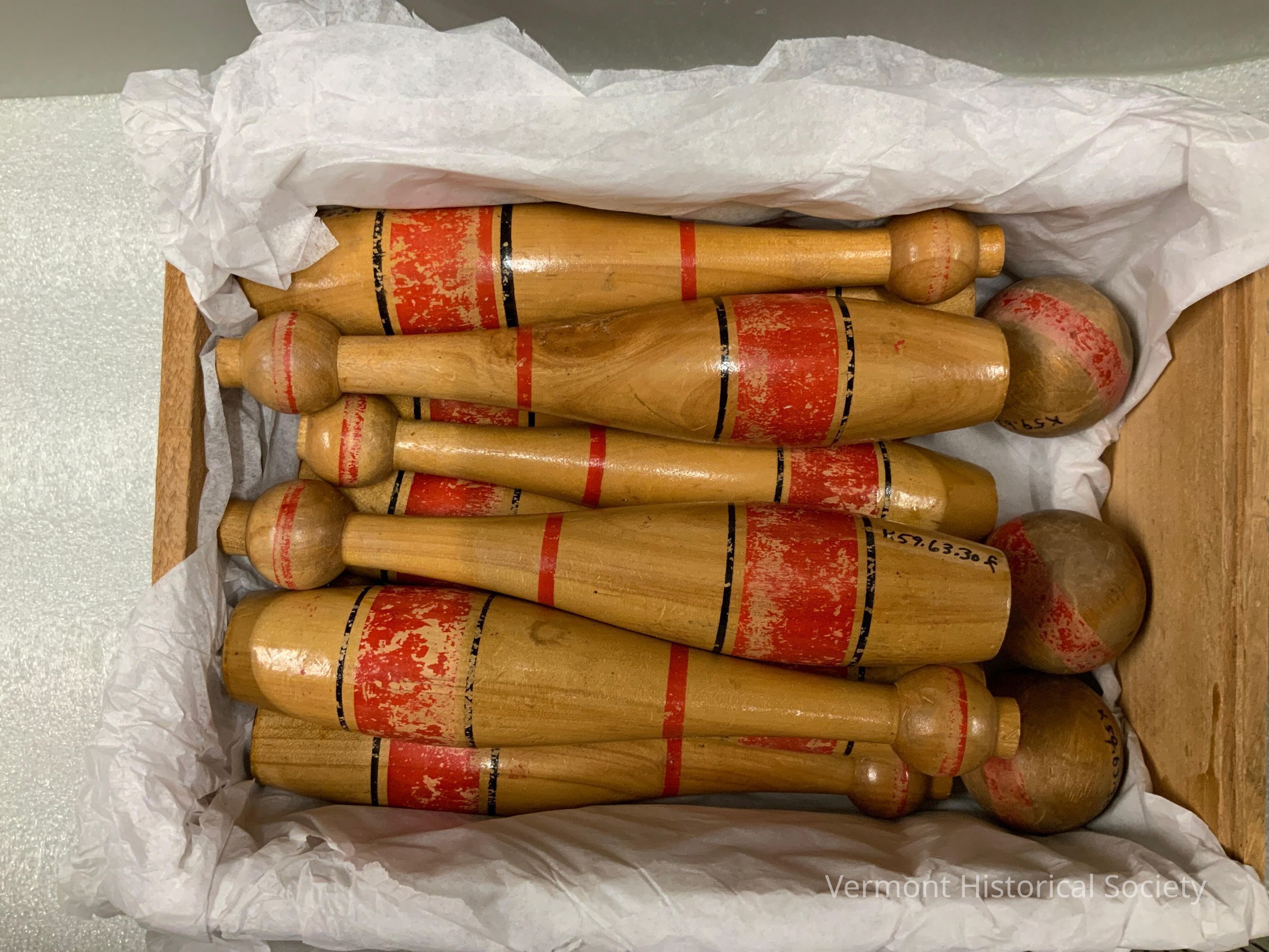 Ten-pin bowling set held in its original wooden crate. The crate has a paper label on one side that reads, "9 INCH TEN PINS". There are 10 pins, each with a red stripe around the widest point, flanked by black stripes. There is a round ball at the top of each pin, and red stripes around the ball and the shoulders. There are three wooden balls in the set, each with a red stripe around the center.Context