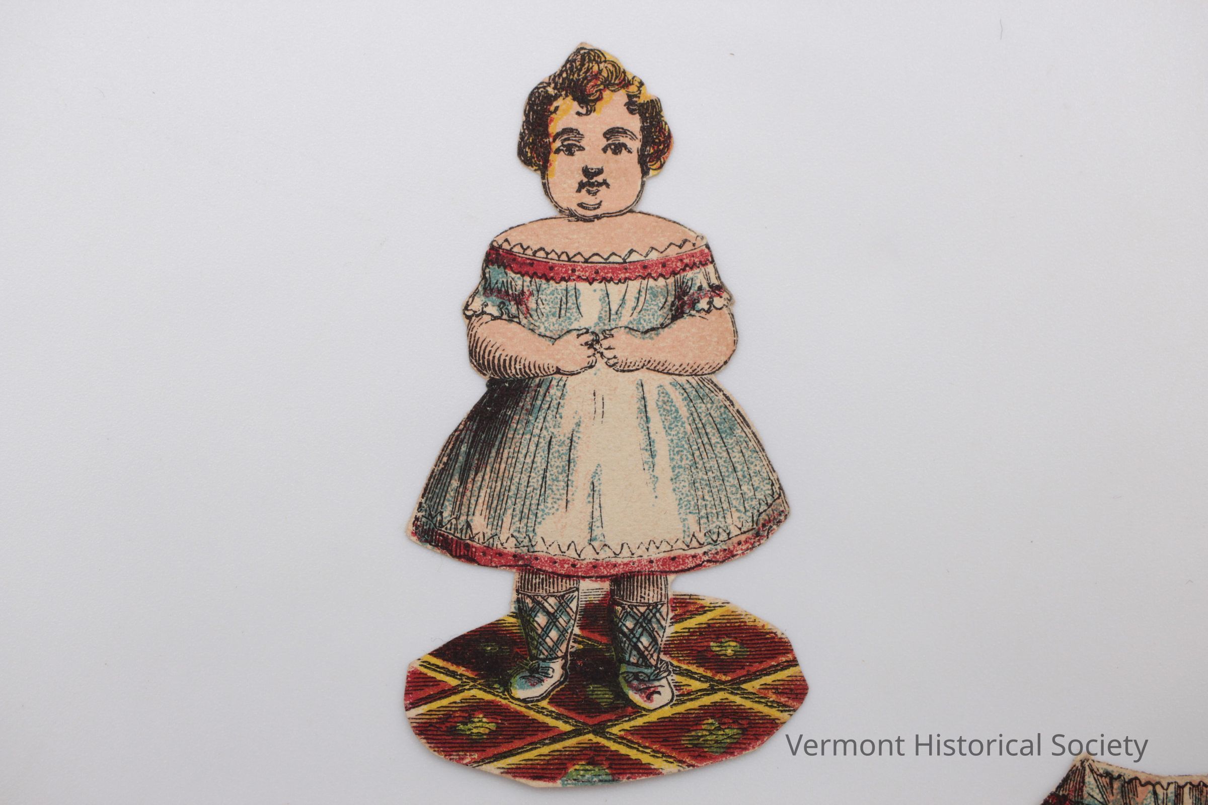Tiny paper doll of a young child with blond hair. It is wearing a white underdress, plaid socks, and white shoes. The base is an oval of red and yellow carpet.