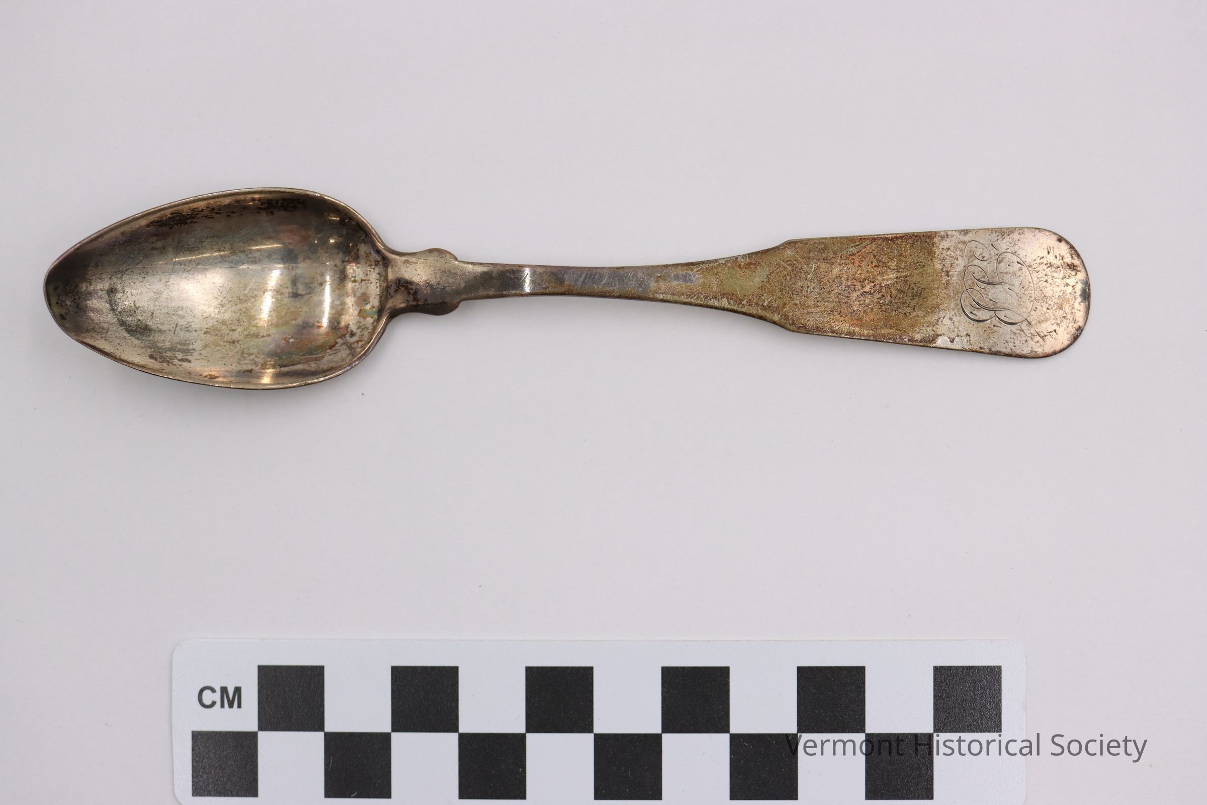One of a pair of coin silver teaspoons engraved with the initials, "SB". The reverse is stamped with the mark, "N. & T. FOSTER" within a scalloped-edged rectangle.