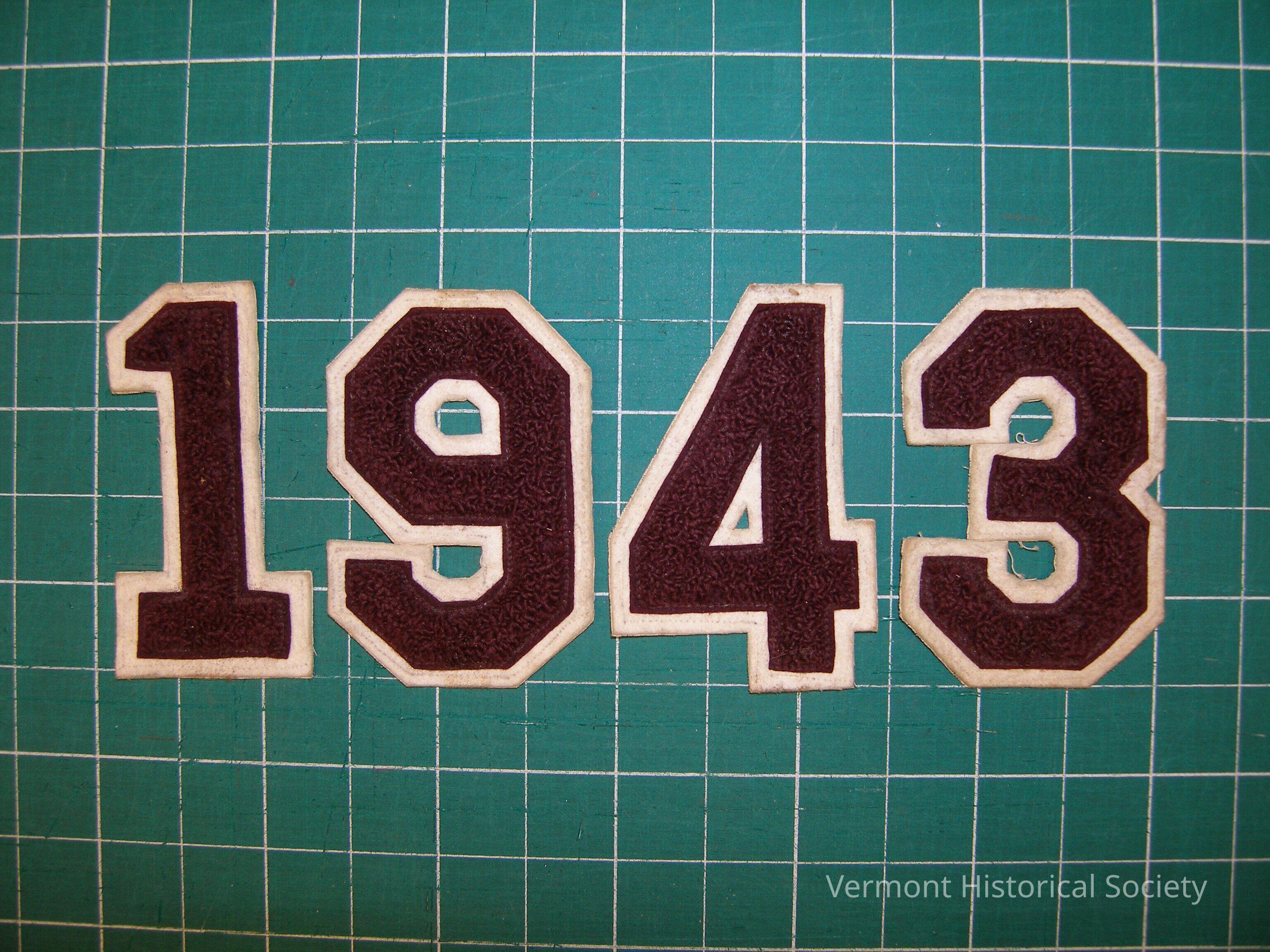 Four varsity patches in the shape of the numbers 1, 9, 4, and 3. Each patch consists of a maroon looped pile fabric appliqued onto white felt, with the felt creating a narrow border. The back is lined with white plain-woven cotton.Context