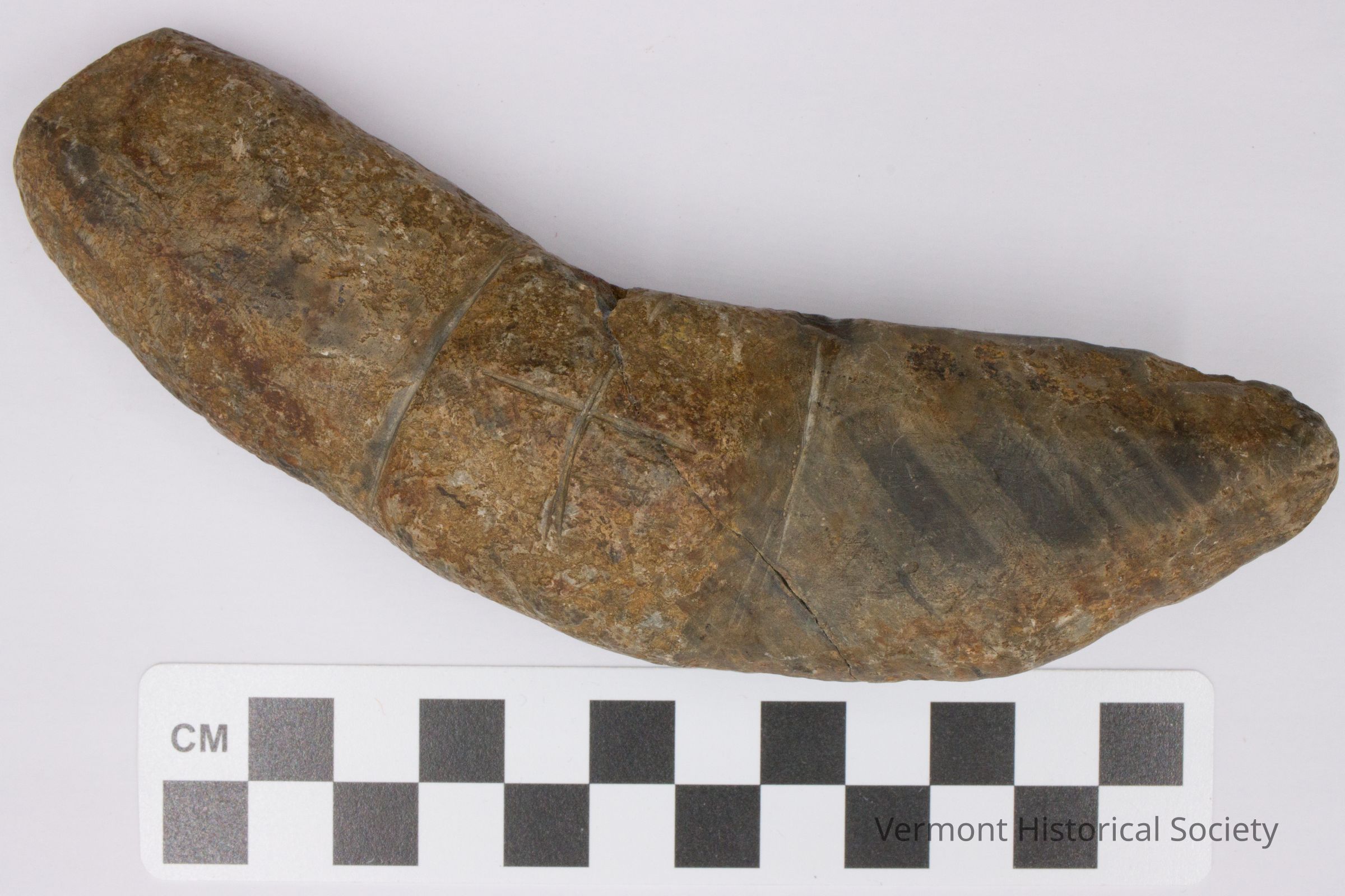 Ground stone double-winged bannerstone without the central hole. There is incised line decoration on one face.