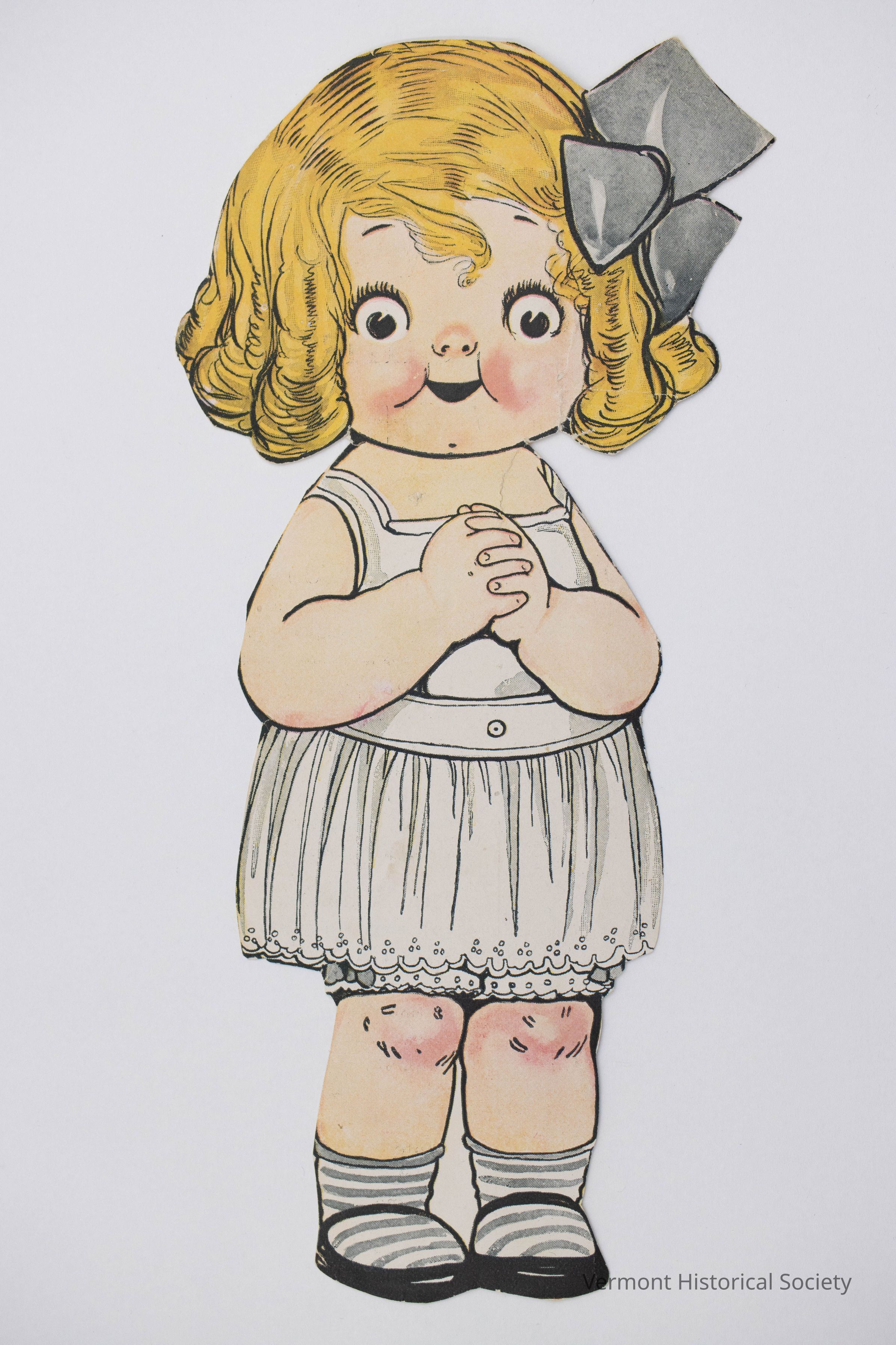 Small paper doll. The doll depicts a young child with yellow hair and pink skin wearing a white dress undergarment, blue-and-white socks, and black shoes. The back shows a portion of a magazine page with an article entitled, "A Twelve Time Christmas Gift", and the handwritten label, "Nellie Besaw".Context