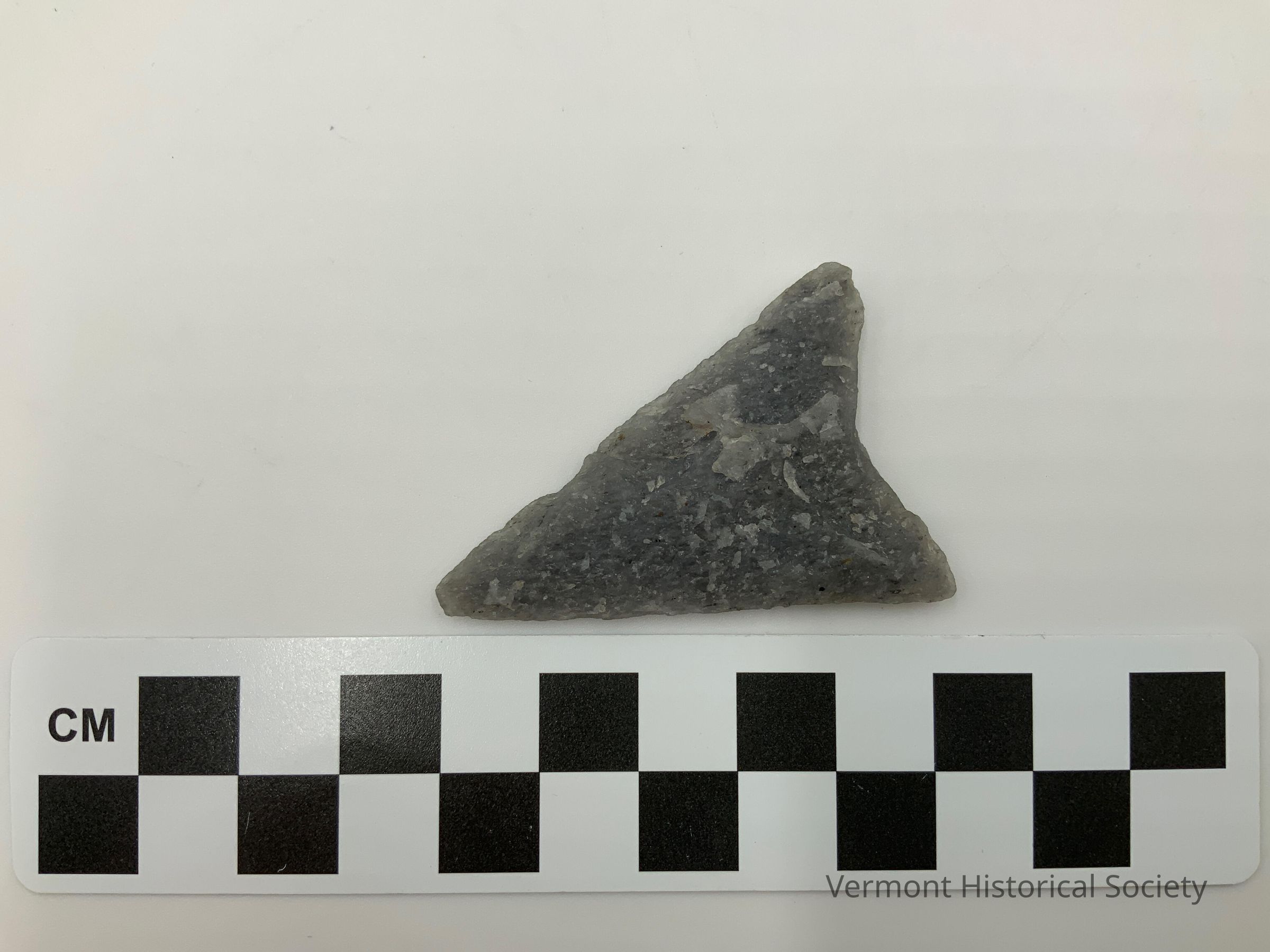 Triangular gray chipped stone projectile point. The blade edges are straight, and the base curves inward.Context
